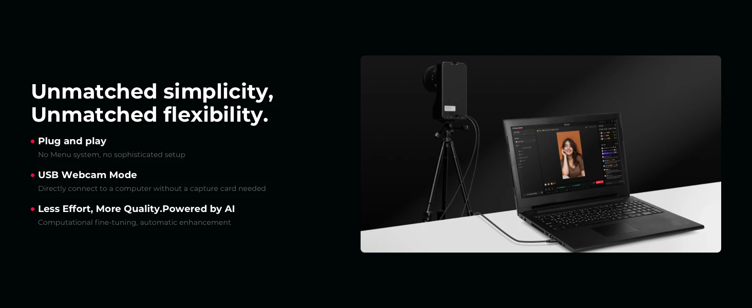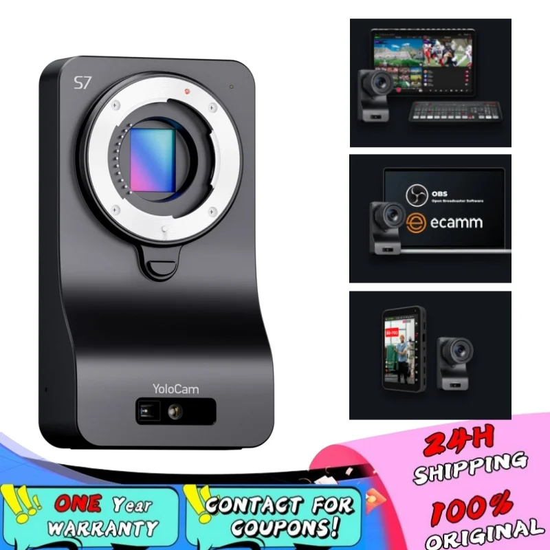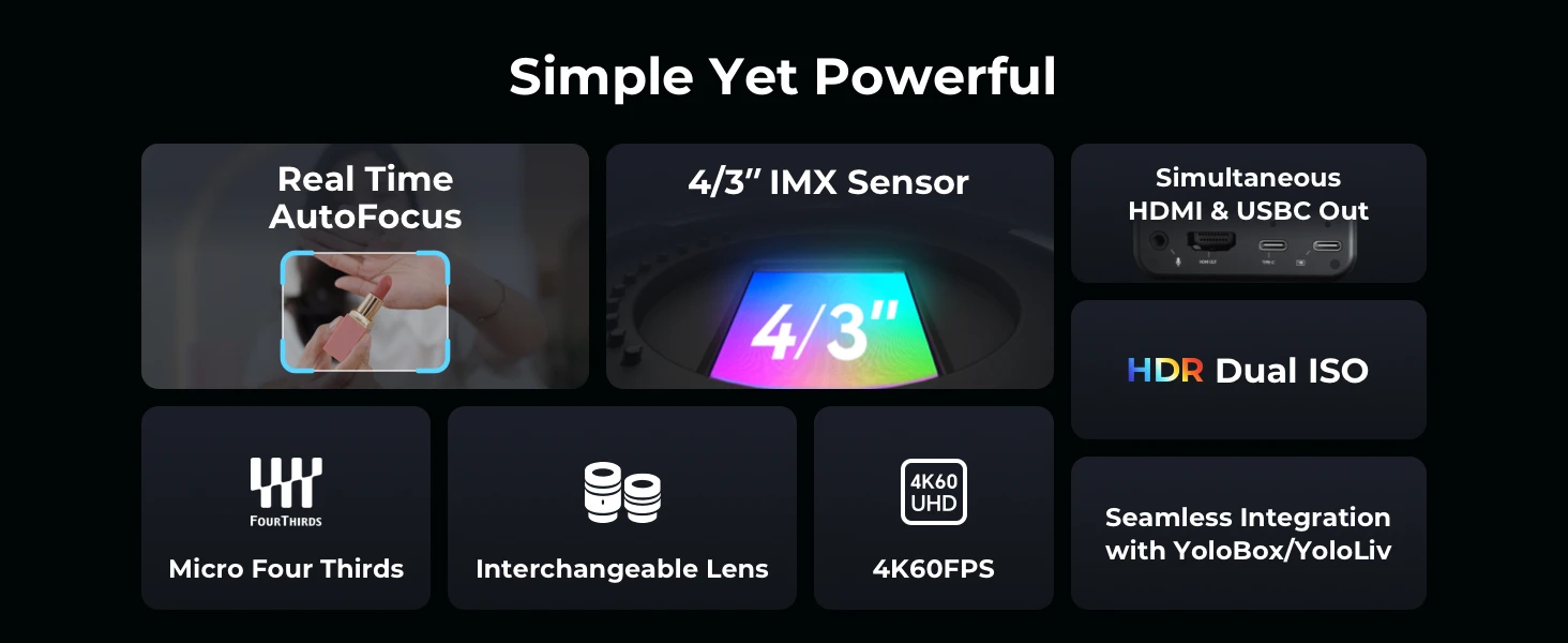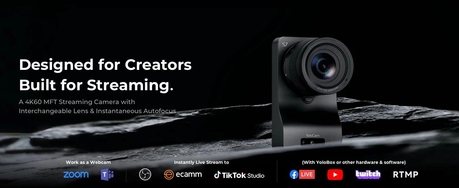 The YoloCam S7 4K60 Streaming Camera from YoloLiv provides plug-and-play video streaming using interchangeable Micro Four Thirds lenses. This compact camera features a large 4/3; sensor, MFT lens mount, real-time autofocus, webcam mode, efficient heat dissipation for 24/7 use, and seamless integration with YoloBox/YoloLiv.