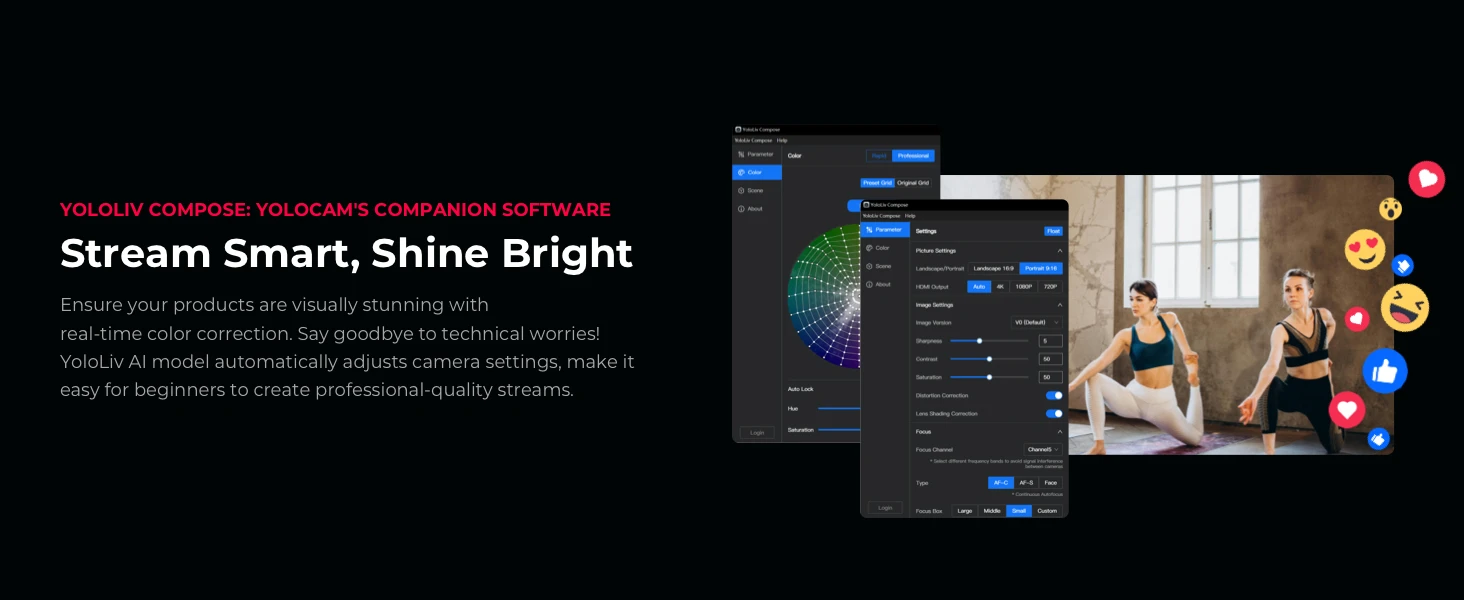Use the YoloLiv Compose software to access real-time color correction and other camera settings, creating professional-looking video streams.