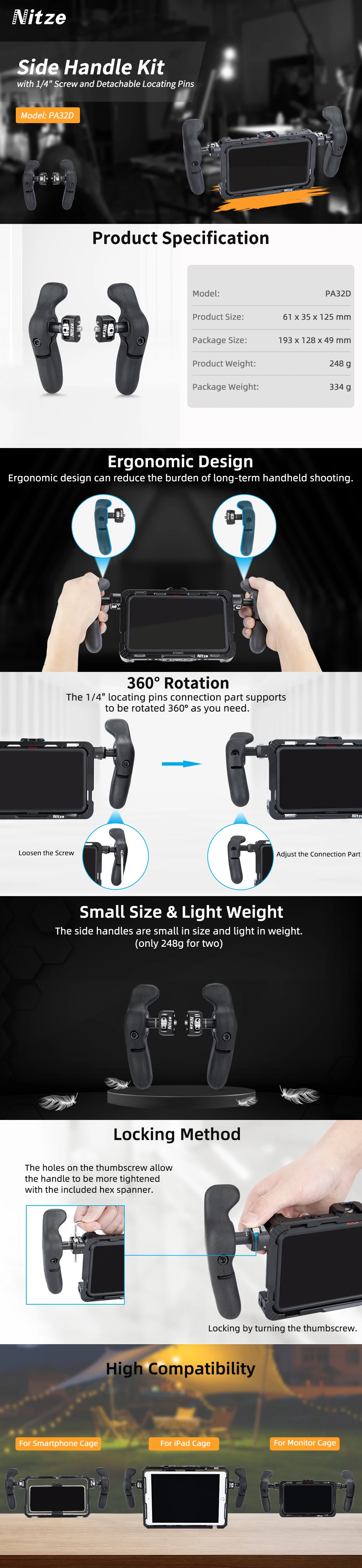 【Ergonomic Design】Nitze PA32D locating pins side handle kit is ergonomically designed. When using it, you can stick your thumb on the top of the handle, which can reduce the burden of long-term handheld shooting. Let you feel relaxed and comfortable when shooting handheld.