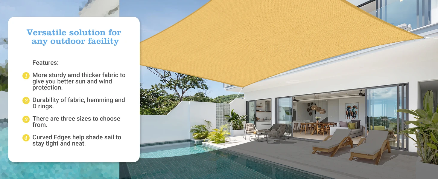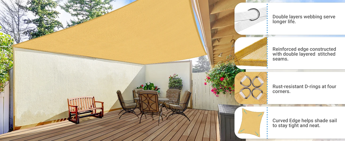 CURVED DESIGN:The edges are expertly curved based on precisely calculated radian, helps shade sail to stay tight and neat after installation, prevent shade sail from sagging in the middle for best appearance and performance