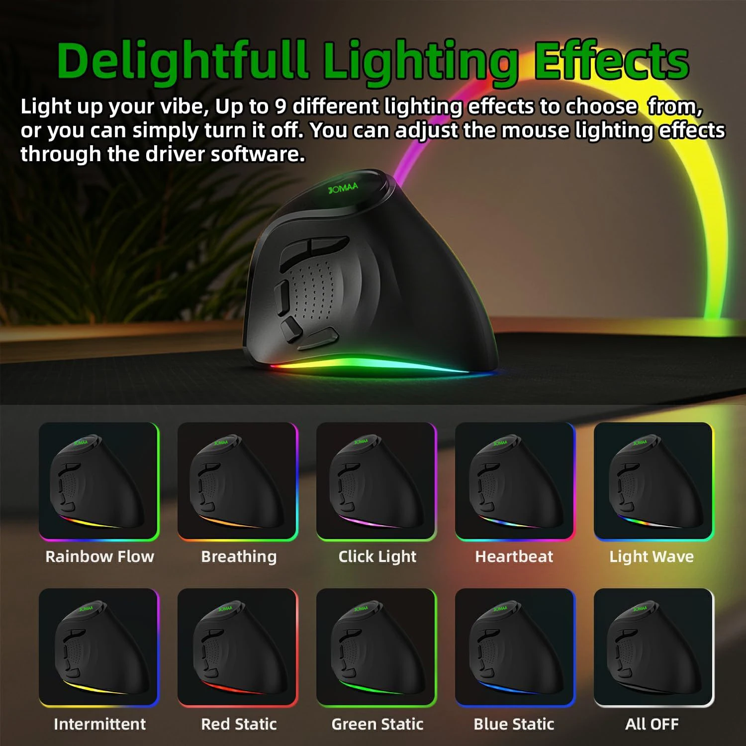 • Comes with 9 different ligting colors effects. Lighting up your productivity. Lights can be turned off.