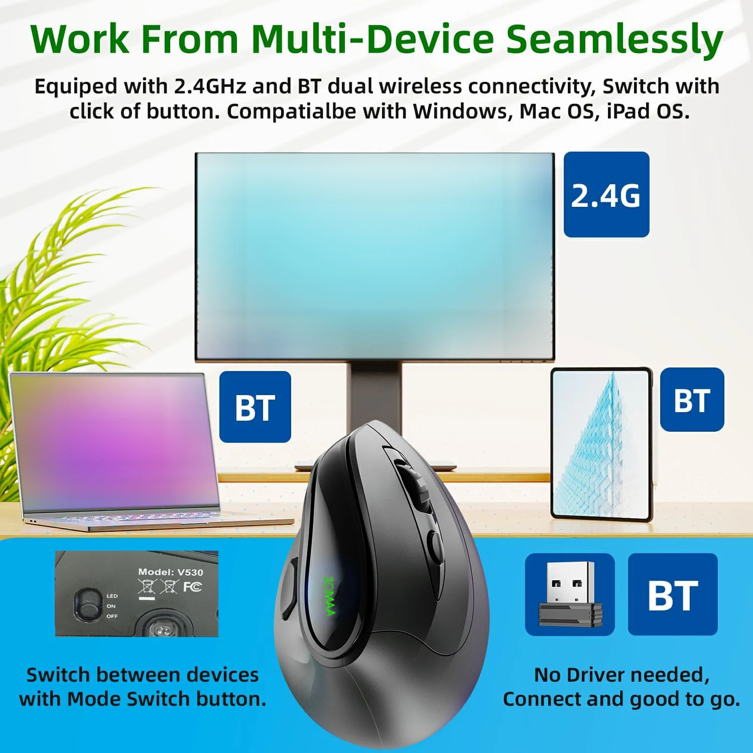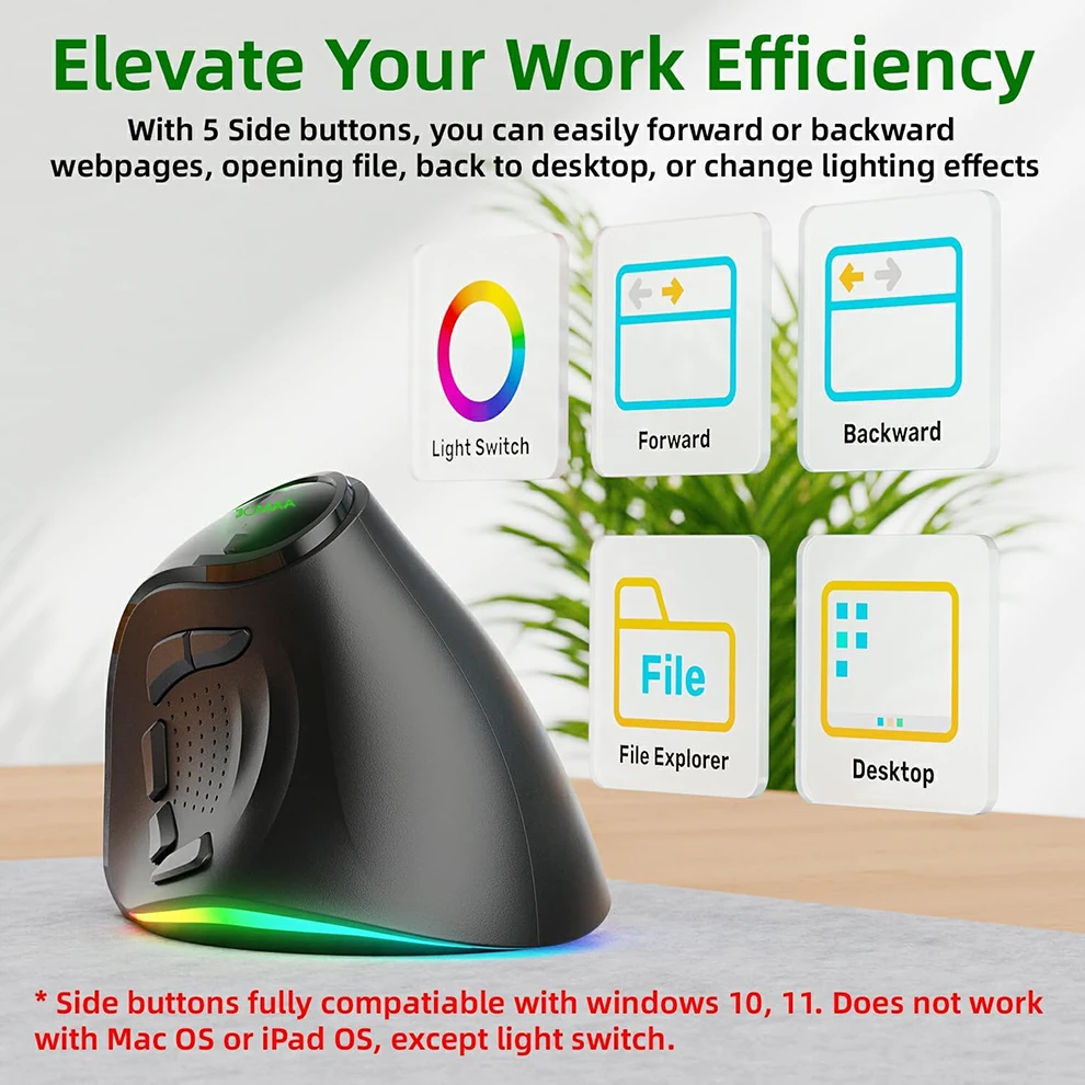 • In BT mode, you can’t use driver software and 7-9 side buttons. The driver software can only be used on Windows OS.【SUPERIOR ERGONOMIC ULTIMATE COMFORT】The IFYOO Vertical Mouse Keeps your hand in a natural handshake postion, reduce the stress and pains on your wirst. Keeps your away form Carpal Tunnel syndrome. Compatiable with Windows, Mac OS, iPad OS. 【NOTICE】Some Side Buttons Shortcut may not work with Mac OS, iPad OS and other OS.