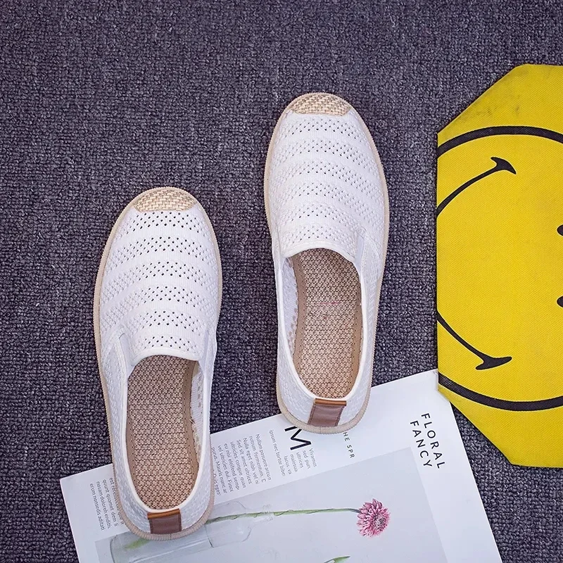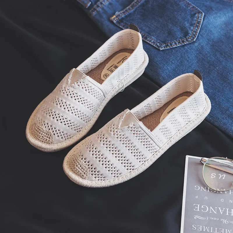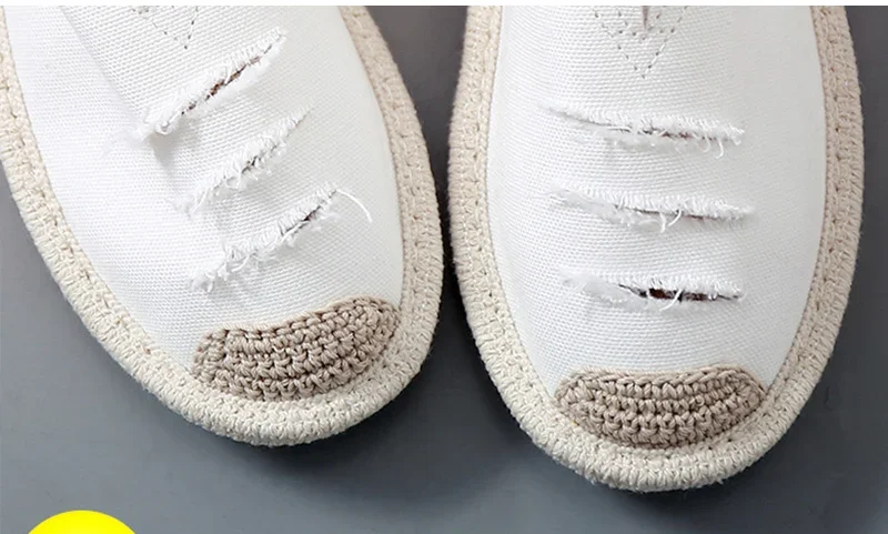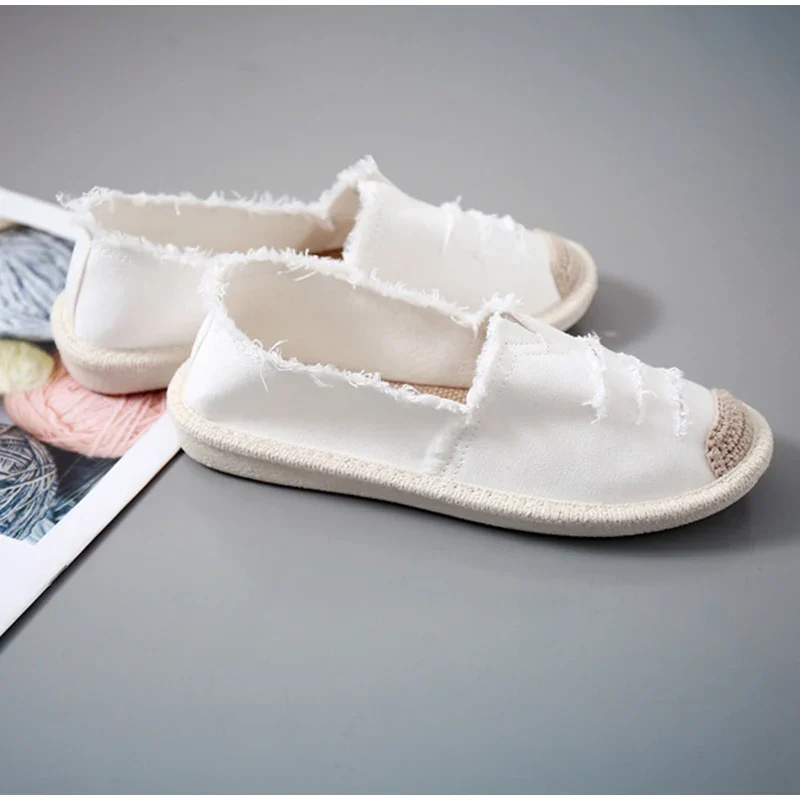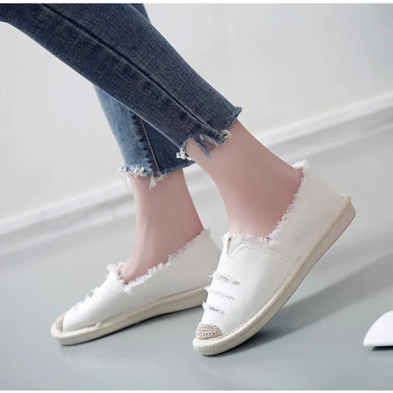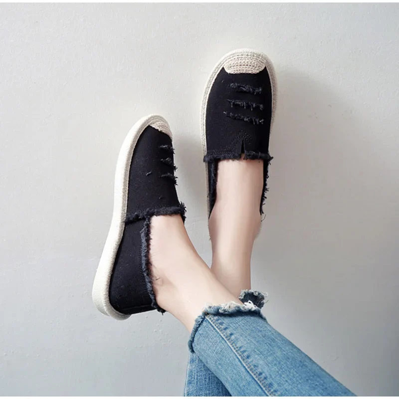 2023 Ladies Casual Comfort Ripped Slip On Lazy Shoes Female Womens Flat Slip On Canvas Summer Strap Loafers Straw Espadrilles