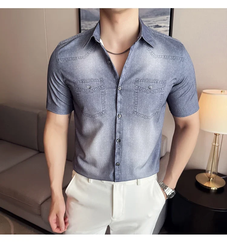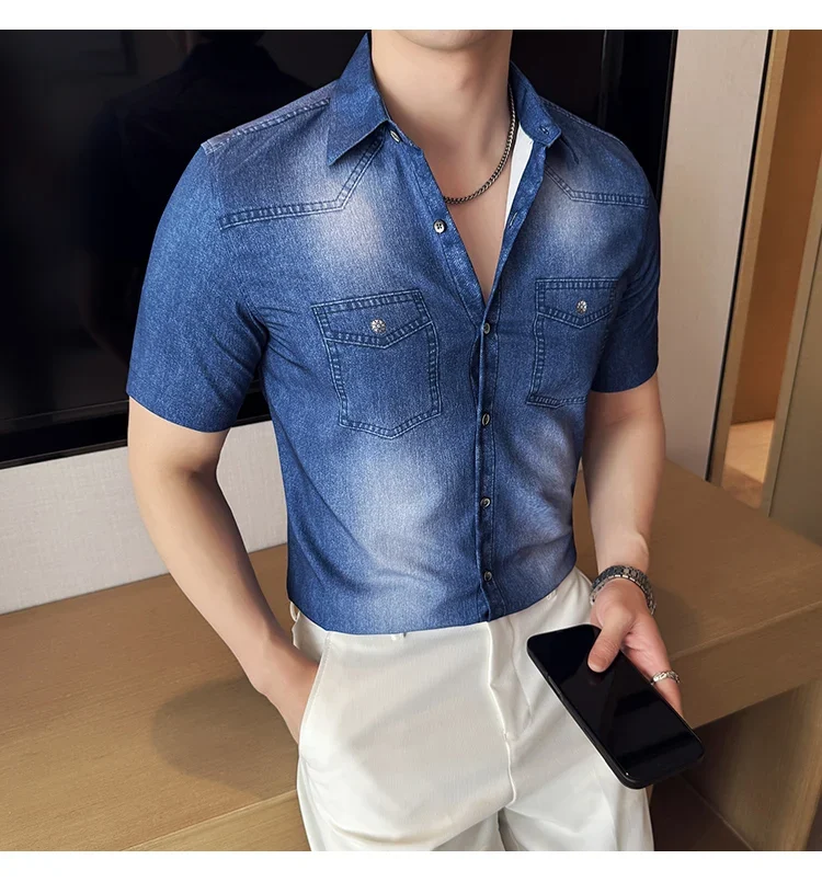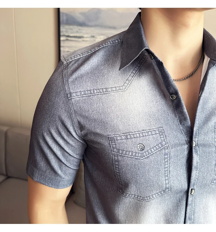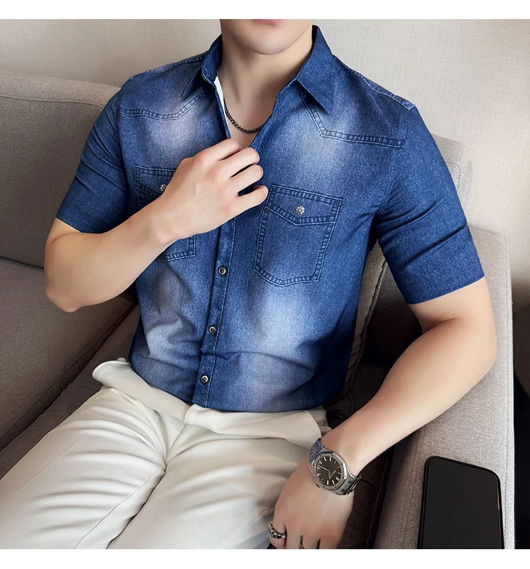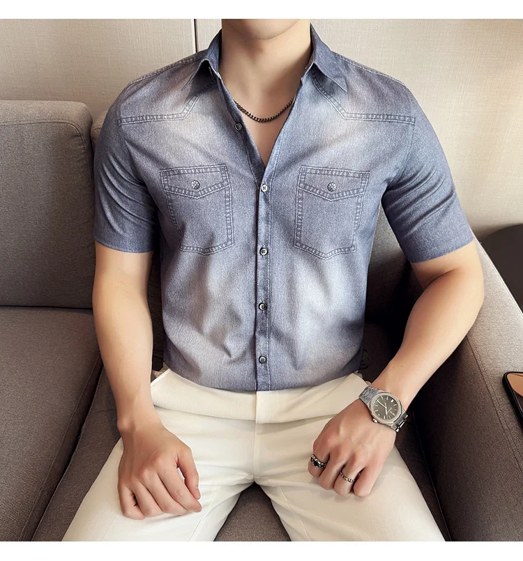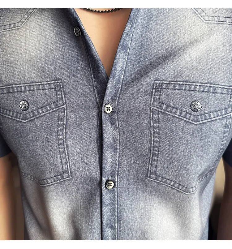 Men’s summer blue short-sleeved denim shirt. Regular size. Casual, trendy street style.