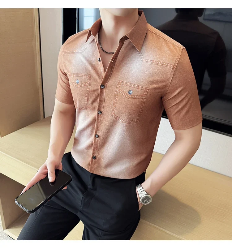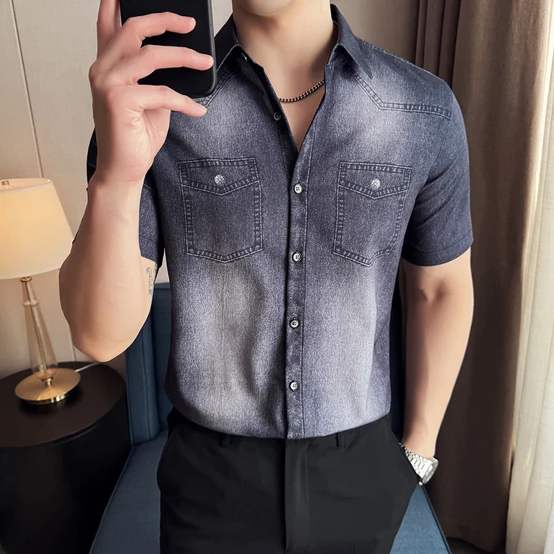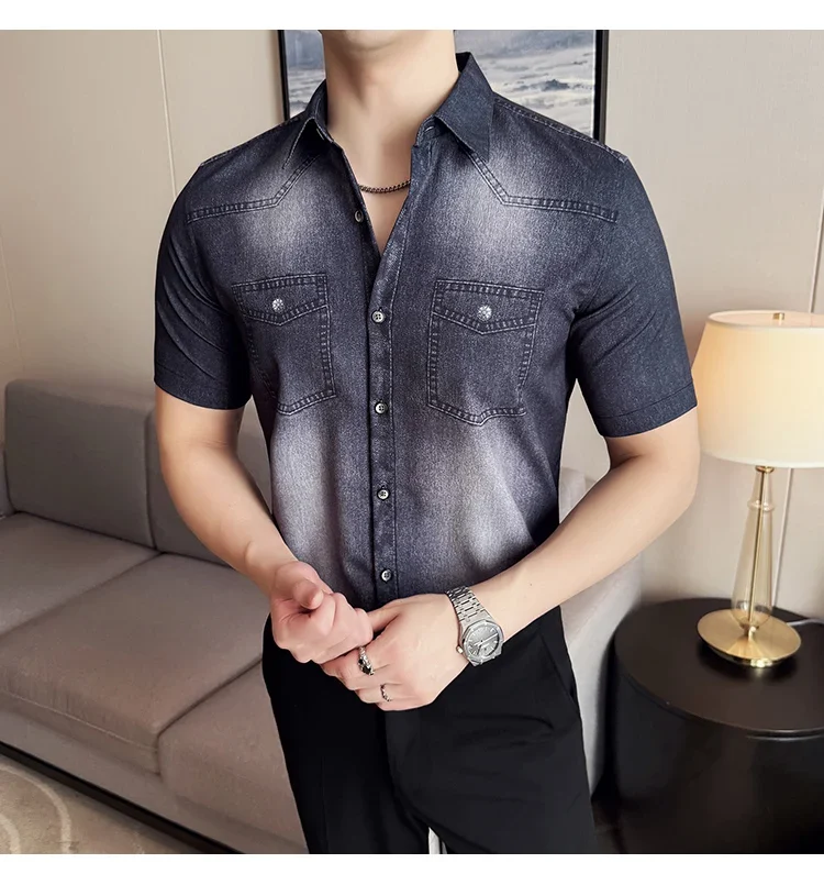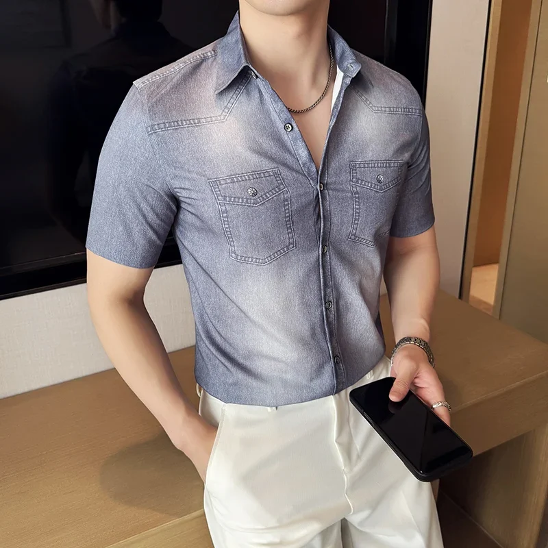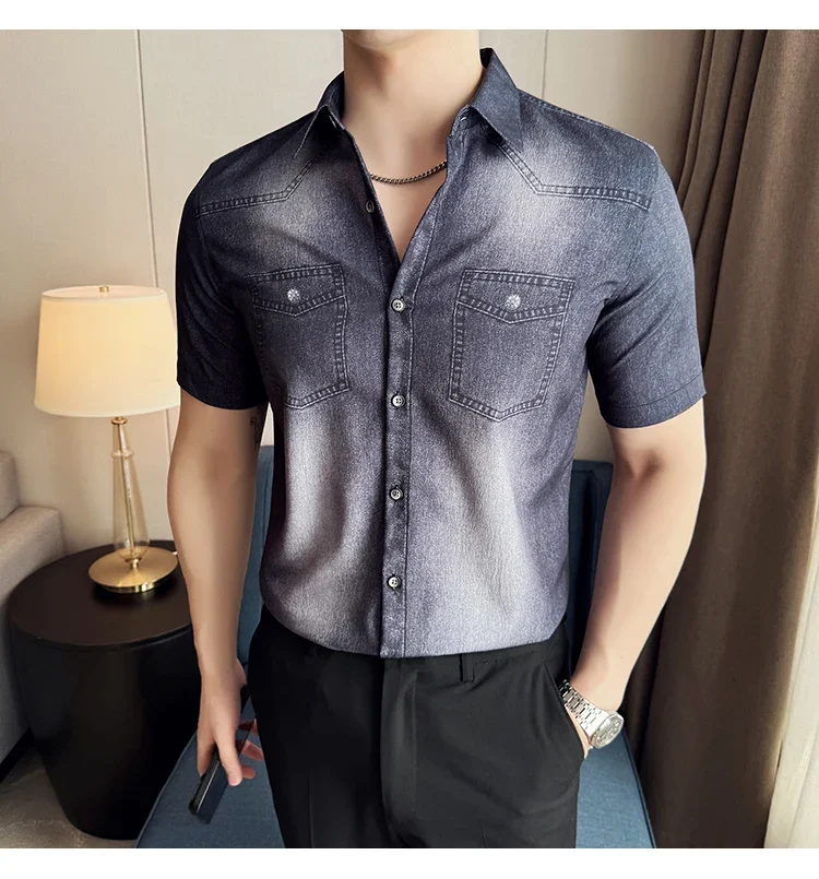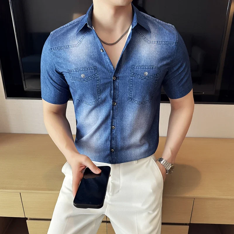 Men’s summer blue short-sleeved denim shirt. Regular size. Casual, trendy street style.