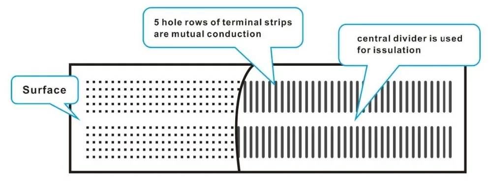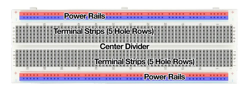 Breadboard rows and columns are numbered and lettered to assist in component placement. Boards with distribution strips also have polarities marked on each strip