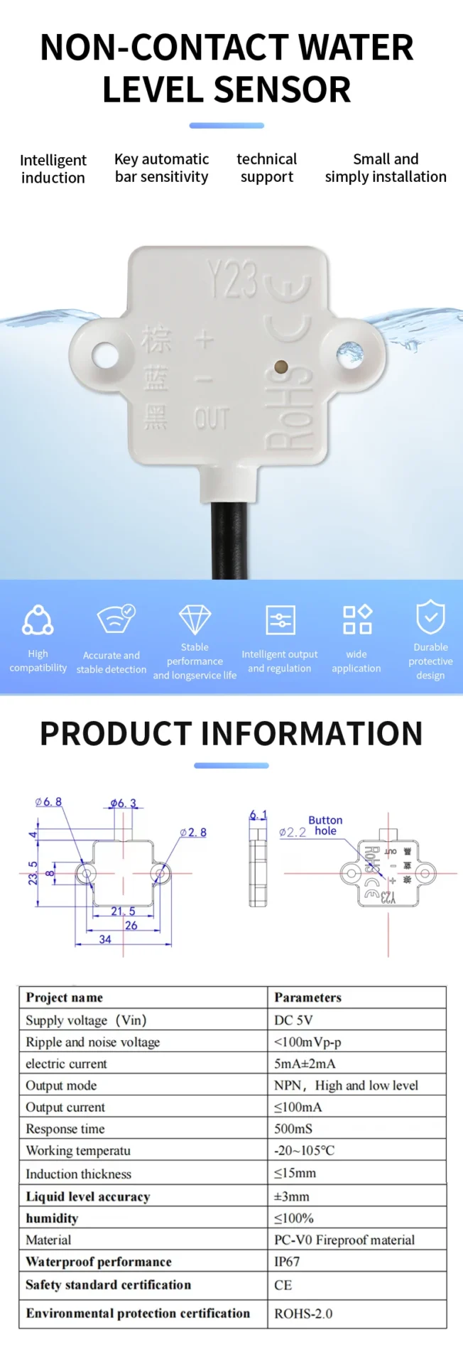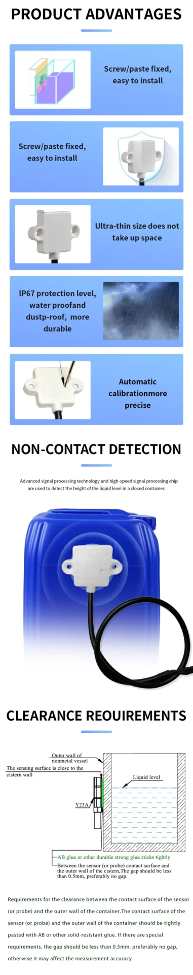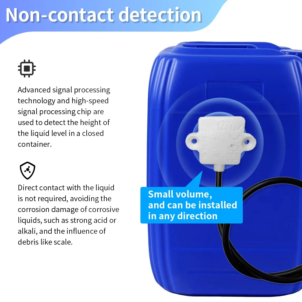 The non-contact liquid level sensor is suitable for the outer wall of non-metallic containers without direct contact with the liquid. It will not be corroded by strong acids and alkalis and other corrosive liquids, and will not be affected by scale or other debris.