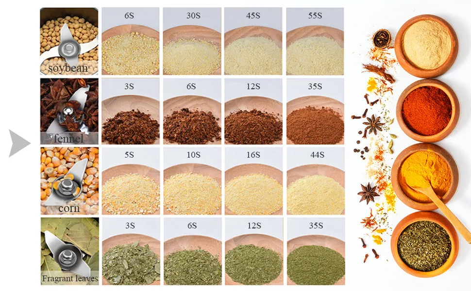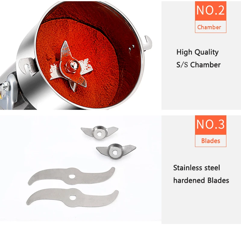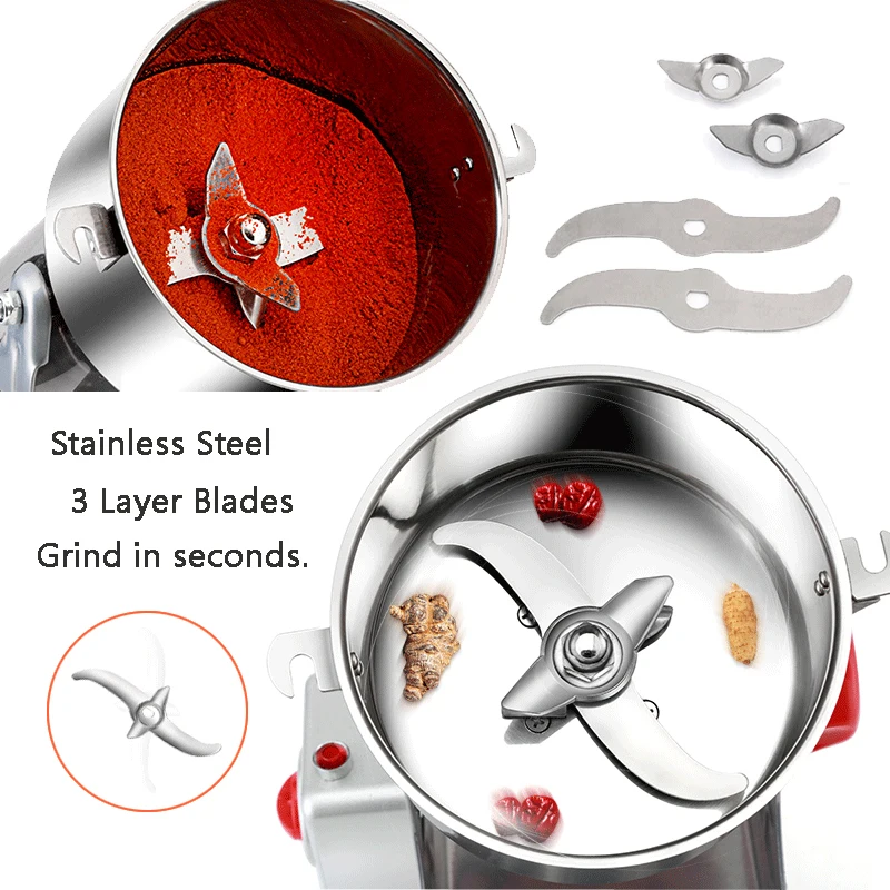 Updated 800G Grinder: Open-cover-stop Safety Design. Automatically stop when the lid is opened. The buckle design can tight the cover to prevent powder from flying