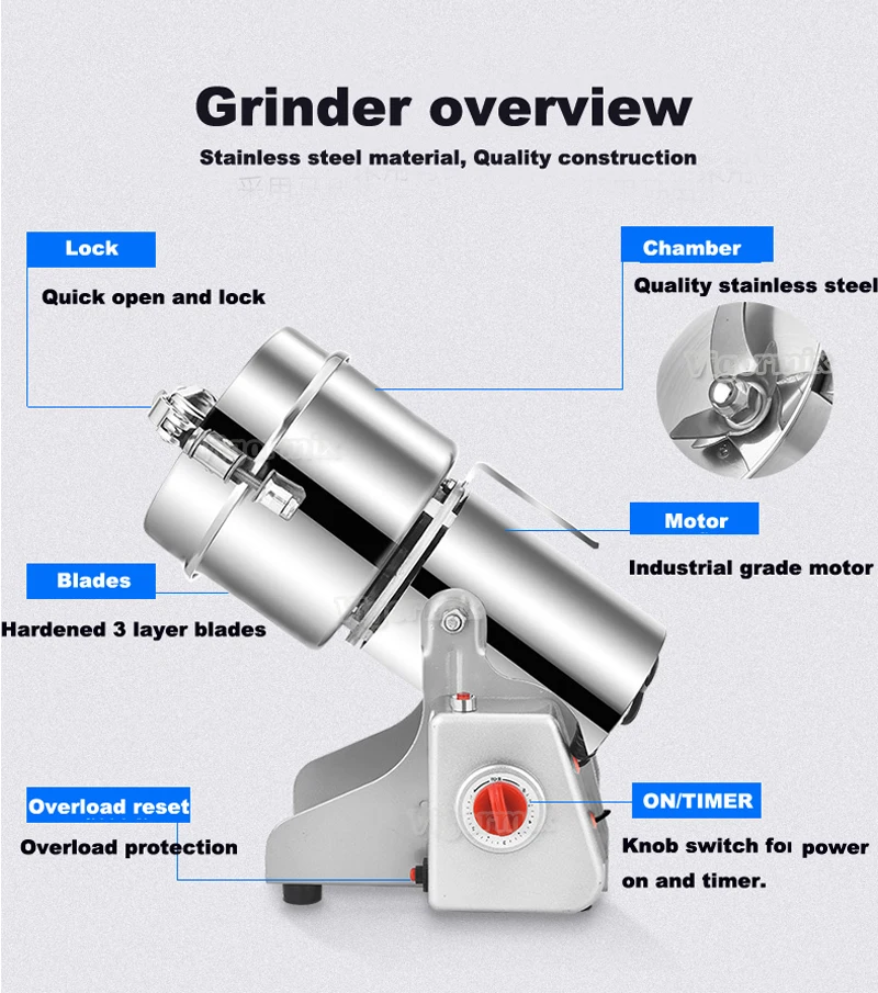 Updated 800G Grinder: Open-cover-stop Safety Design. Automatically stop when the lid is opened. The buckle design can tight the cover to prevent powder from flying