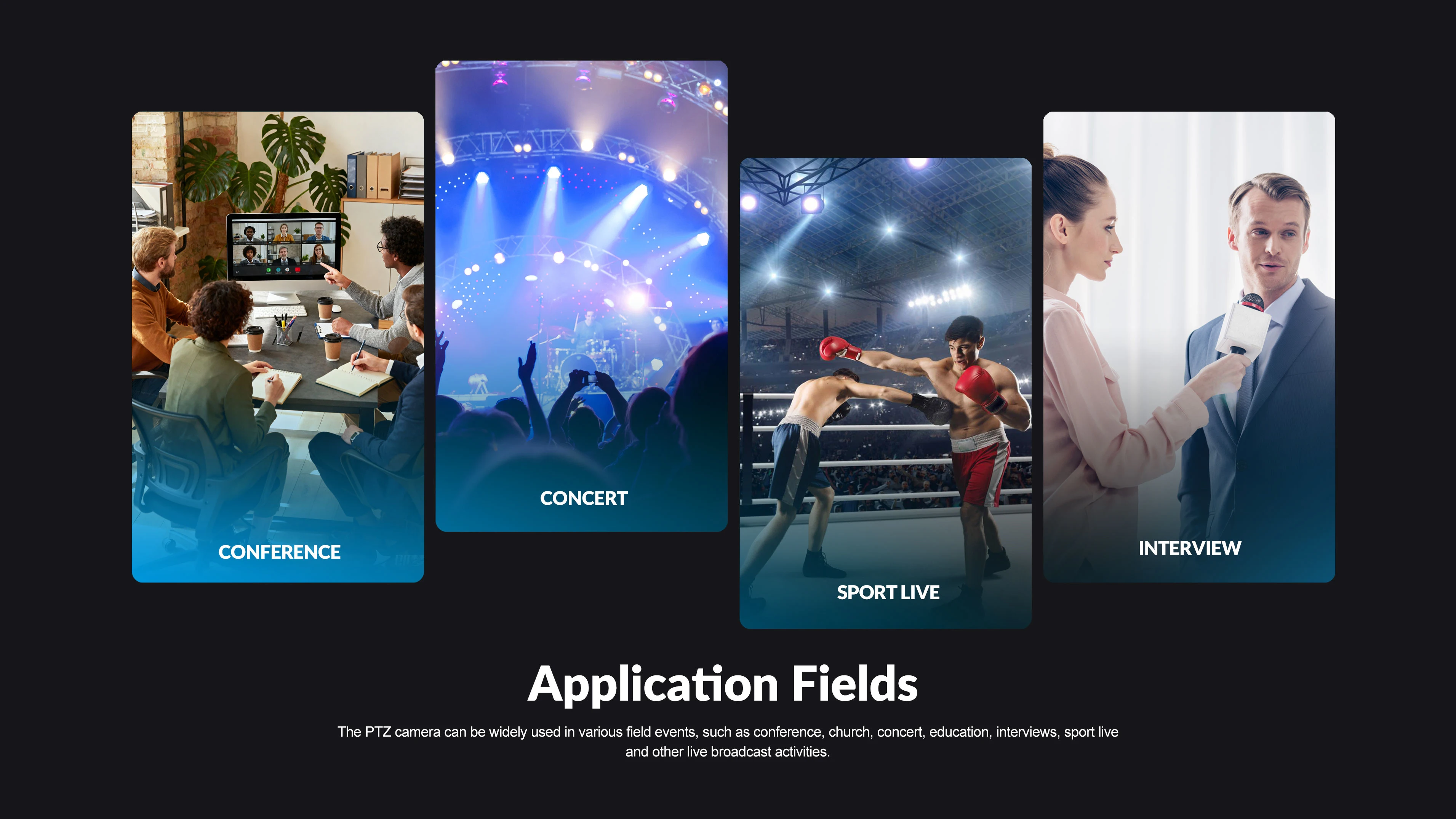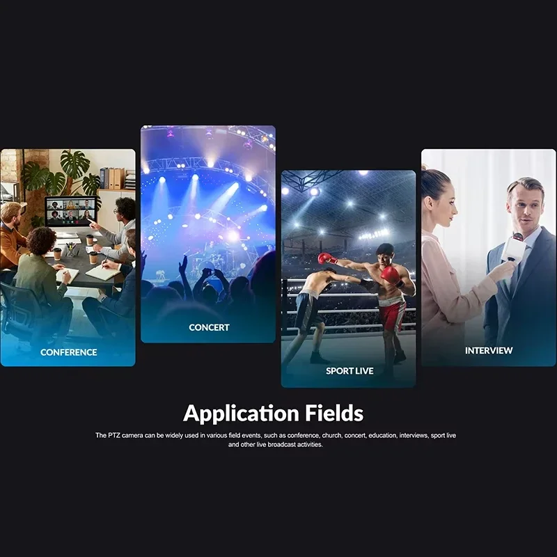 The PTZ camera can be widely used in various field events, such as conference, church, concert, education, interviews, sport live and other live broadcast activities.