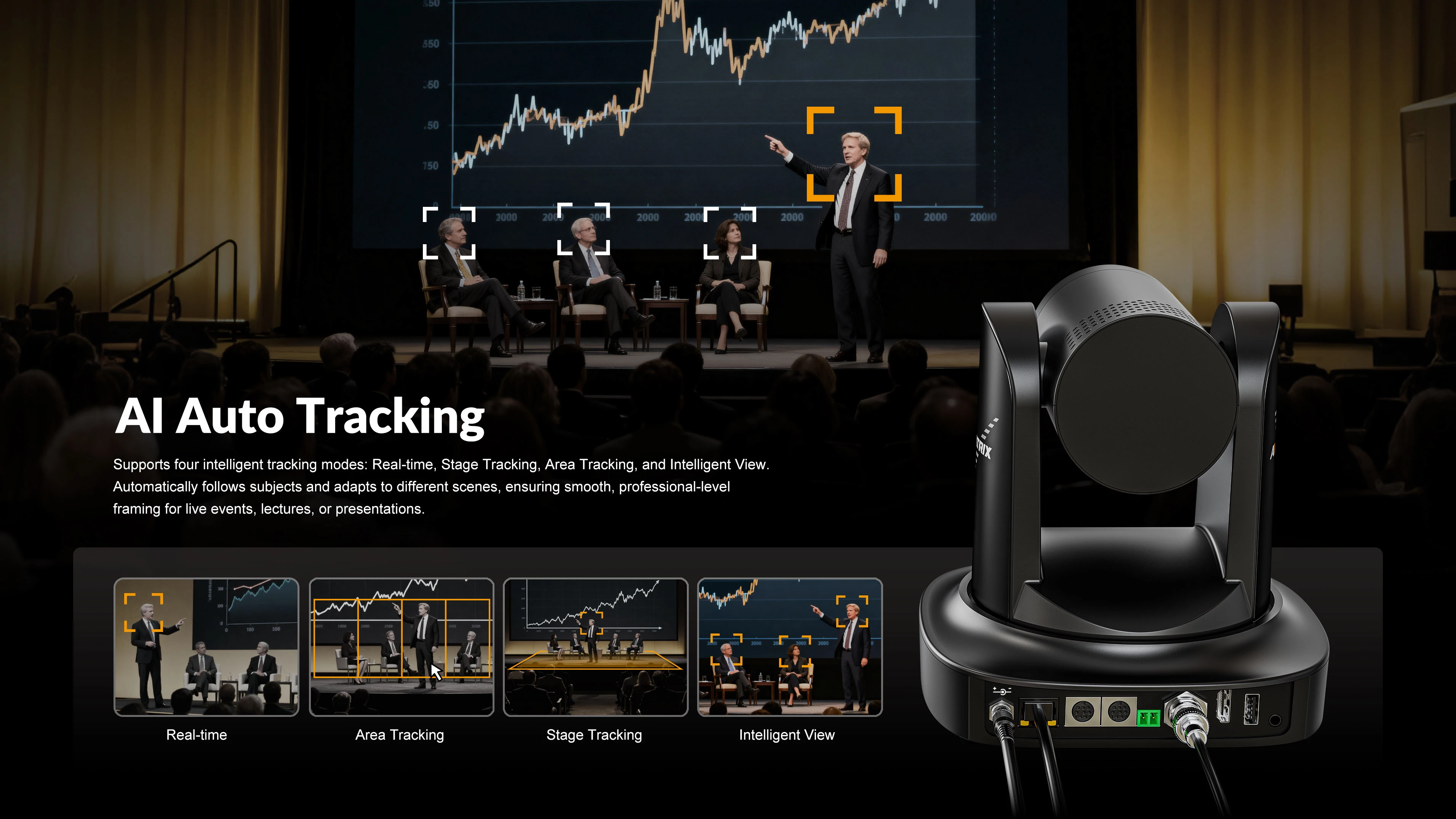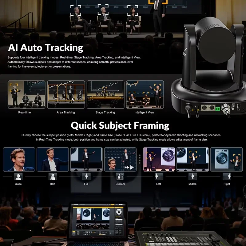 Supports four intelligent tracking modes: Real-time, Stage Tracking, Area Tracking, and Intelligent View. Automatically follows subjects and adapts to different scenes, ensuring smooth, professional-level framing for live events, lectures, or presentations.