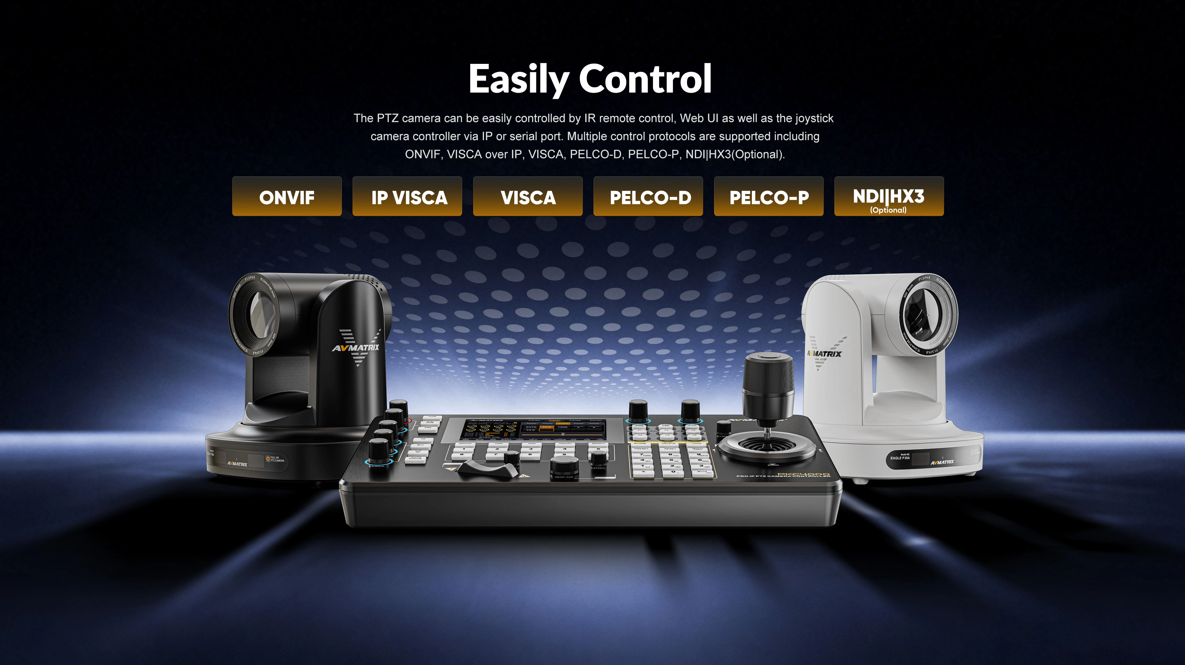 The PTZ camera can be easily controlled by IR remote control, Web Ul as well as the joystick camera controller via IP or serial port. Multiple control protocols are supported including ONVIF, VISCA over IP, VISCA, PELCO-D, PELCO-P, NDIIHX3(Optional).
