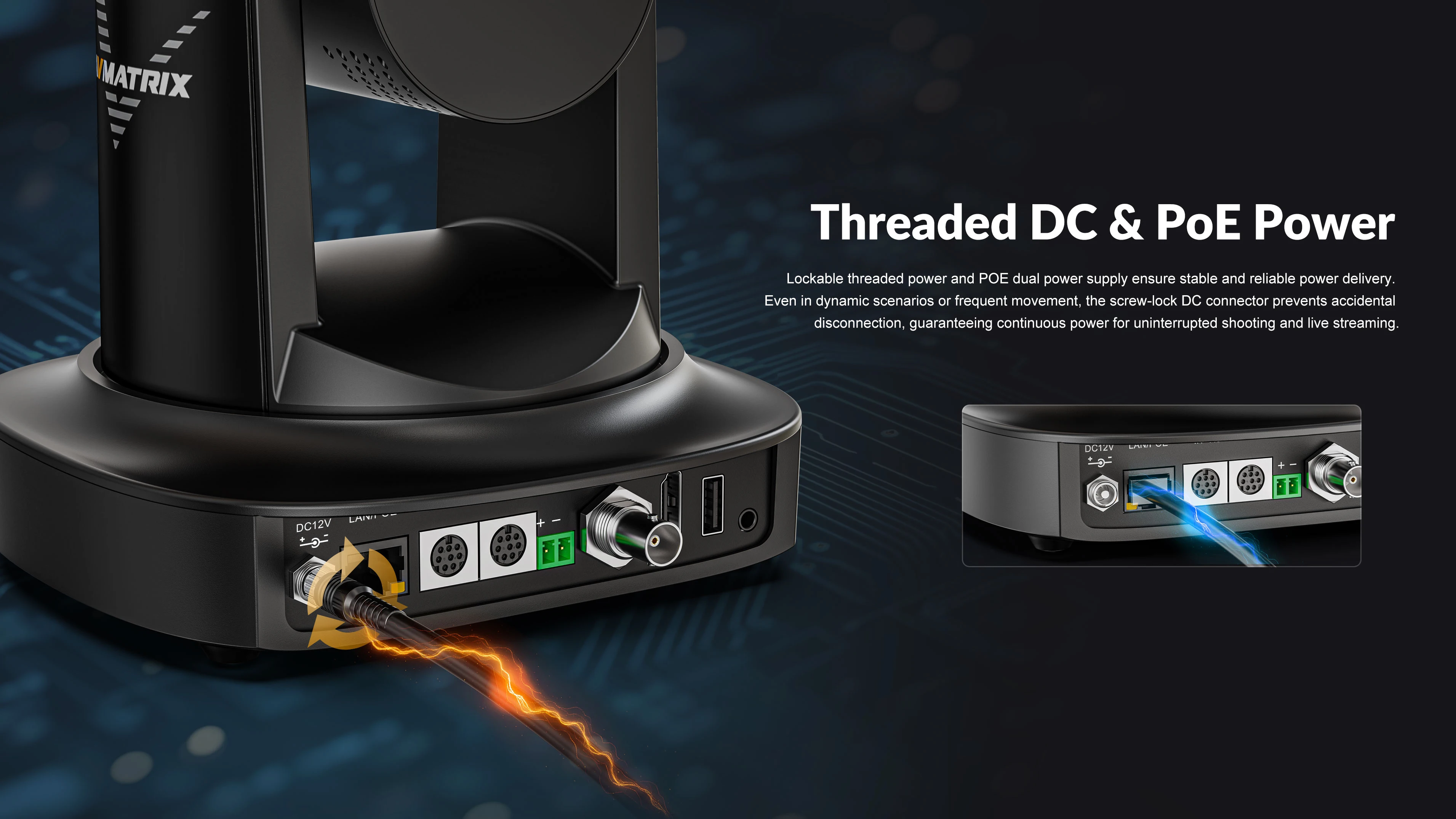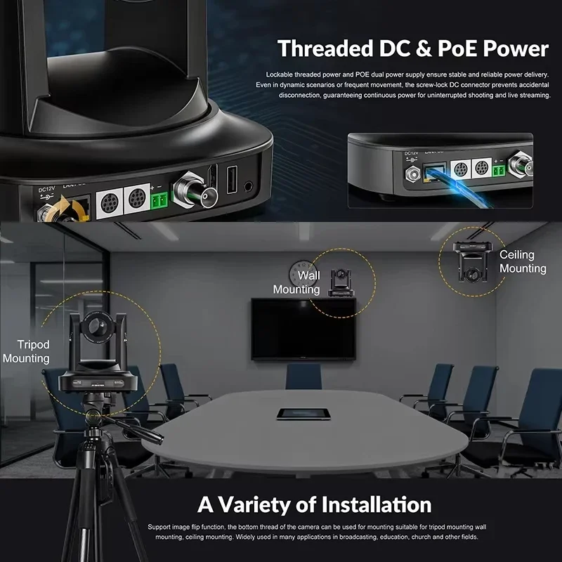 Lockable threaded power and POE dual power supply ensure stable and reliable power delivery. Even in dynamic scenarios or frequent movement, the screw-lock DC connector prevents accidental disconnection, guaranteeing continuous power for uninterrupted shooting and live streaming.