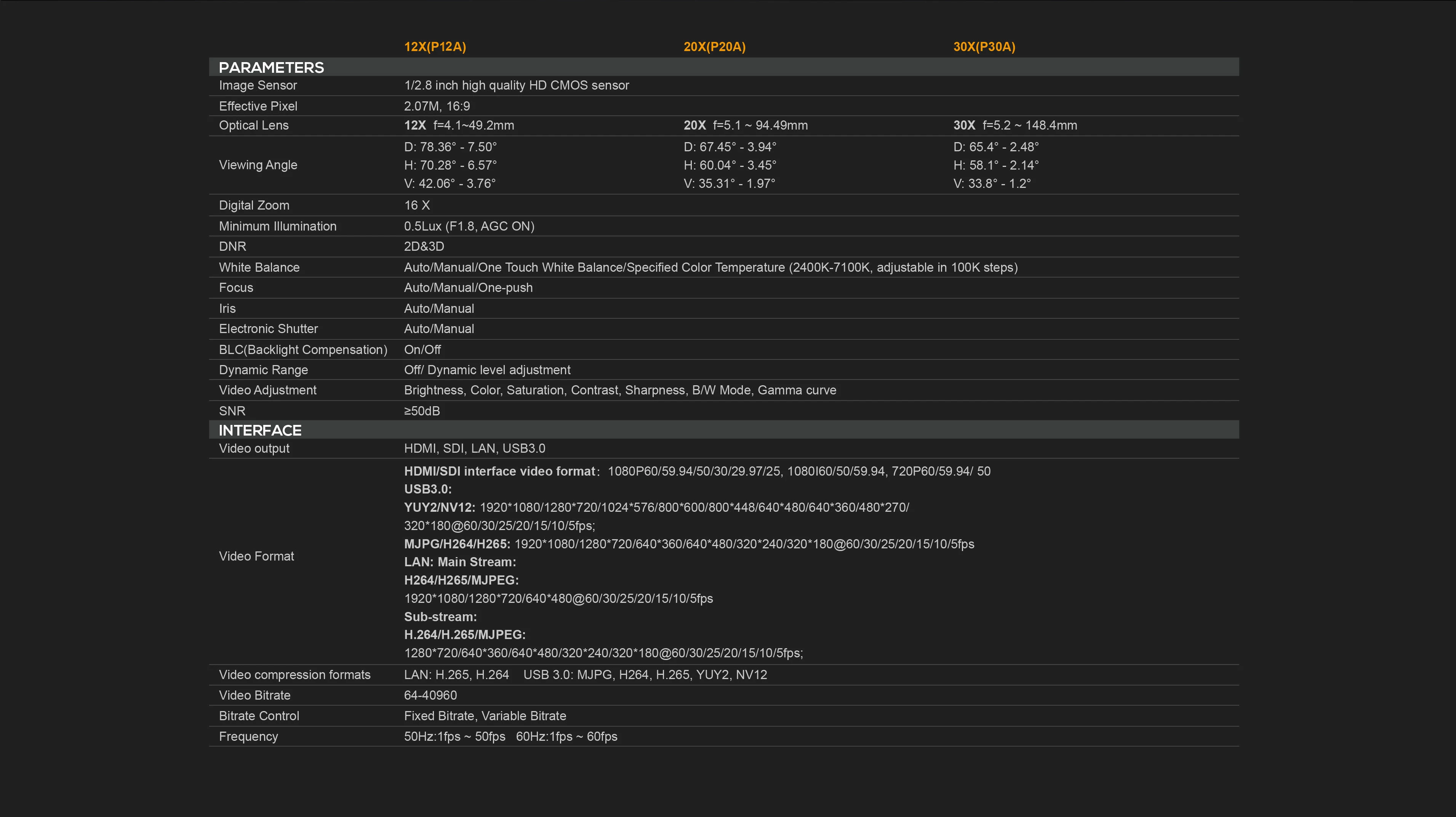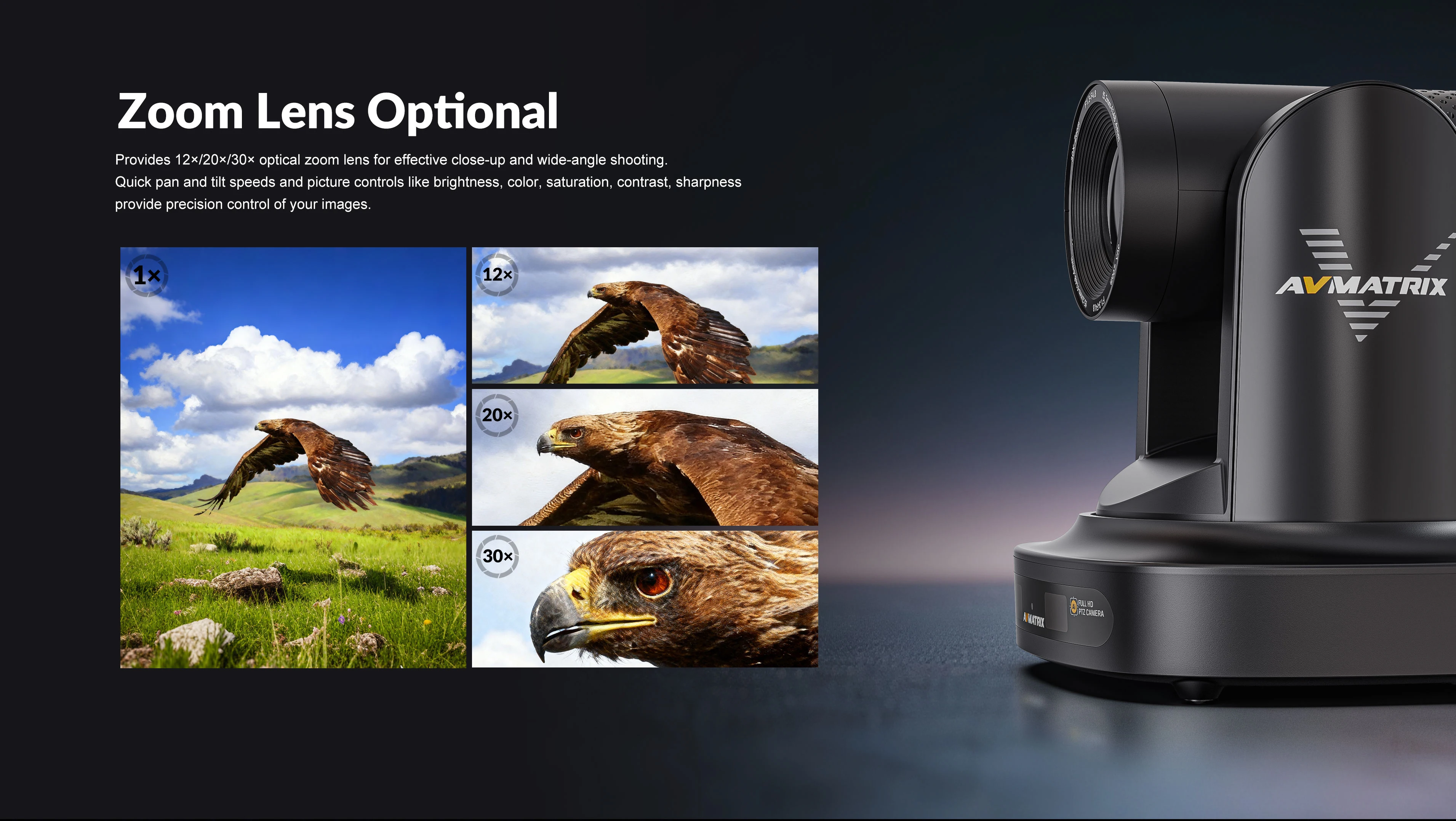 Provides 12×/20×/30x optical zoom lens for effective close-up and wide-angle shooting. Quick pan and tilt speeds and picture controls like brightness, color, saturation, contrast, sharpness provide precision control of your images.