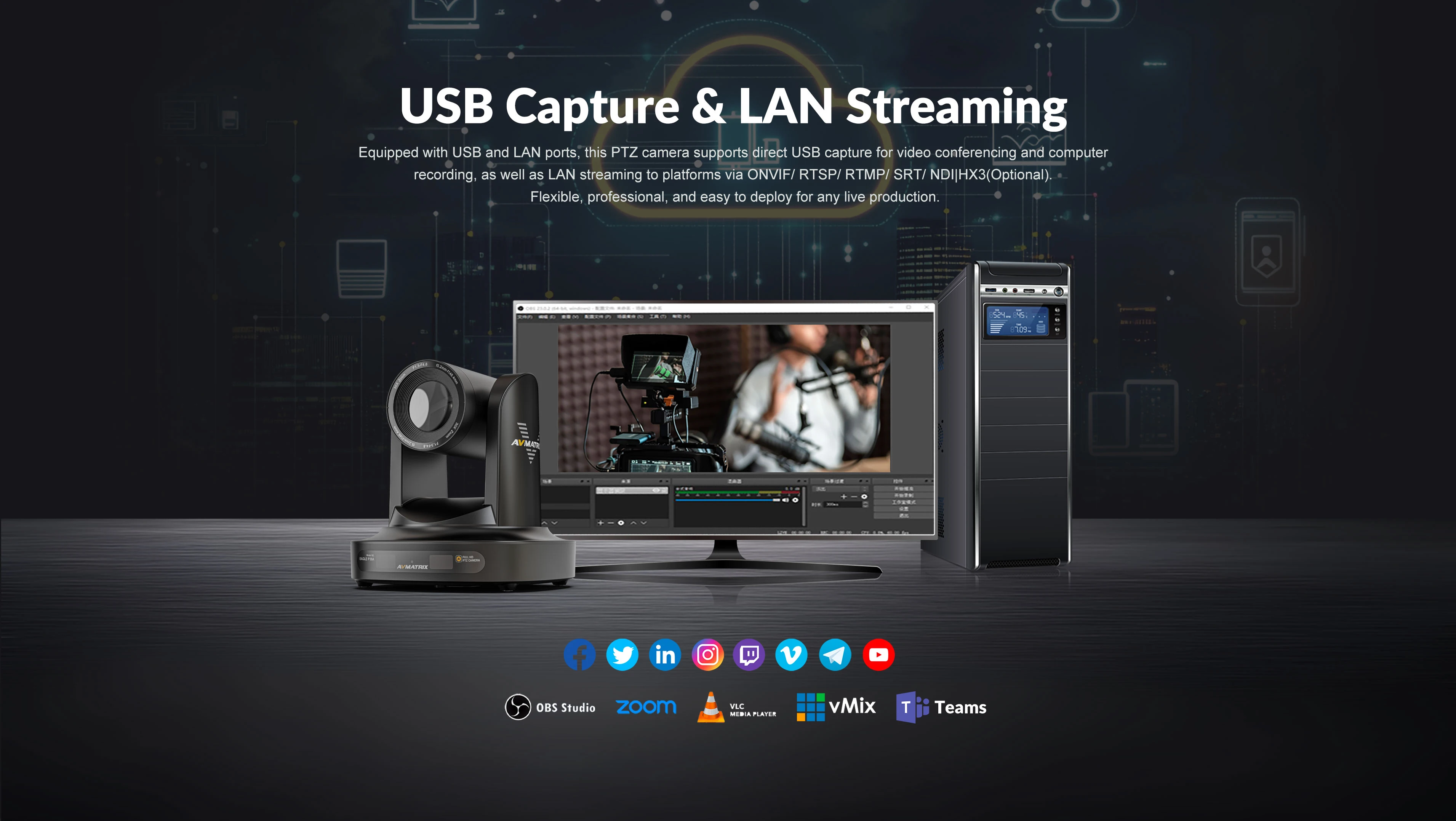 Equipped with USB and LAN ports, this PTZ camera supports direct USB capture for video conferencing and computer recording, as well as LAN streaming to platforms via ONVIF/ RTSP/ RTMP/ SRT/ NDIIHX3(Optional). Flexible, professional, and easy to deploy for any live production.
