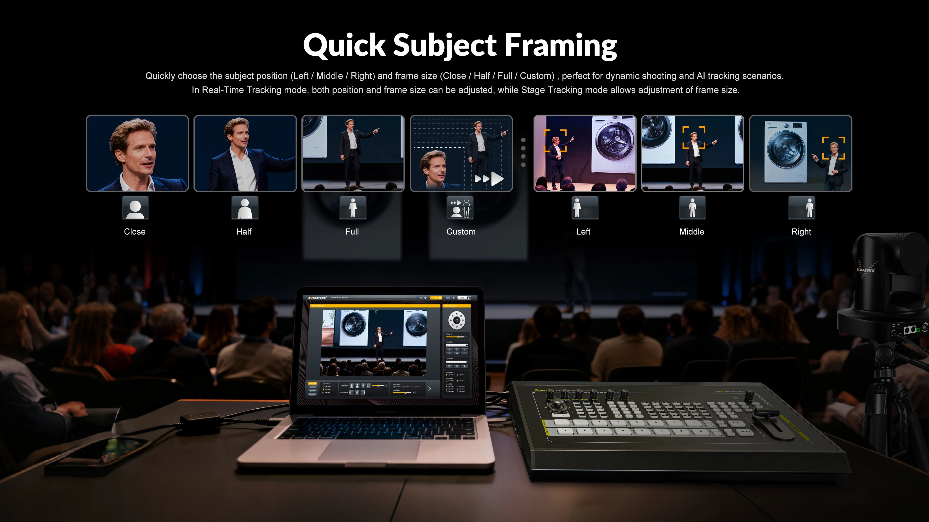 Quickly choose the subject position (Left /Middle / Right) and frame size (Close / Half / Full/ Custom), perfect for dynamic shooting and Al tracking scenarios.l In Real-Time Tracking mode, both position and frame size can be adjusted, while Stage Tracking mode allows adjustment of frame size.