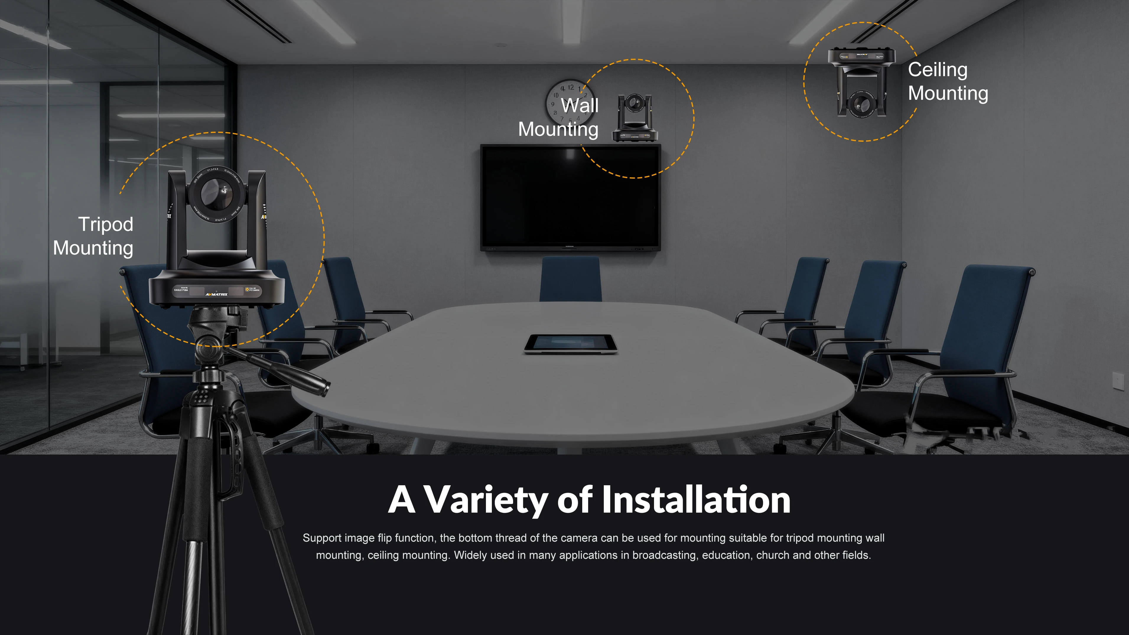 Support image flip function, the bottom thread of the camera can be used for mounting suitable for tripod mounting wall mounting, ceiling mounting. Widely used in many applications in broadcasting, education, church and other fields.
