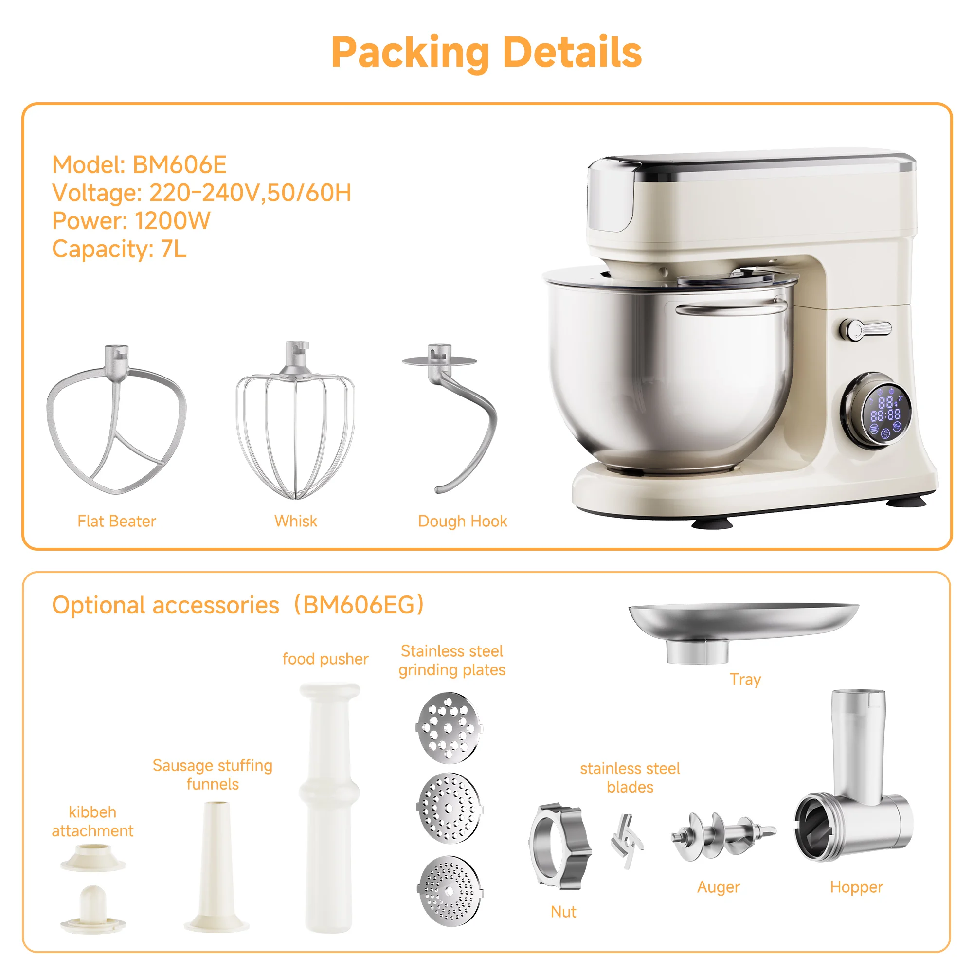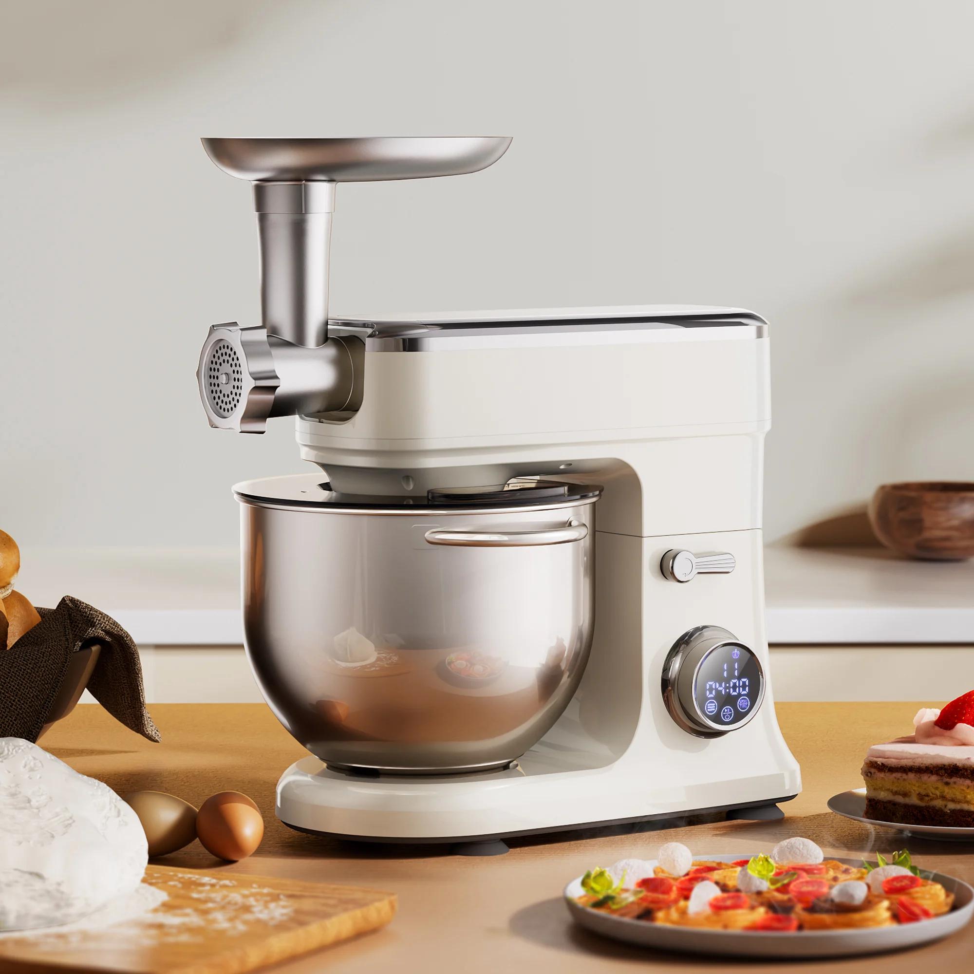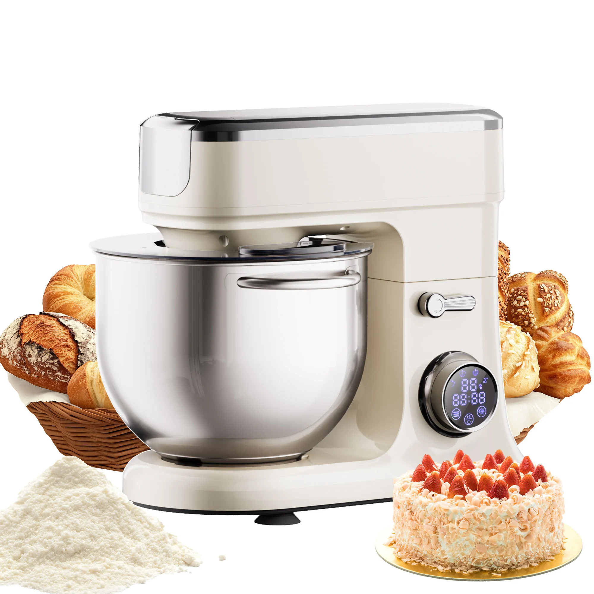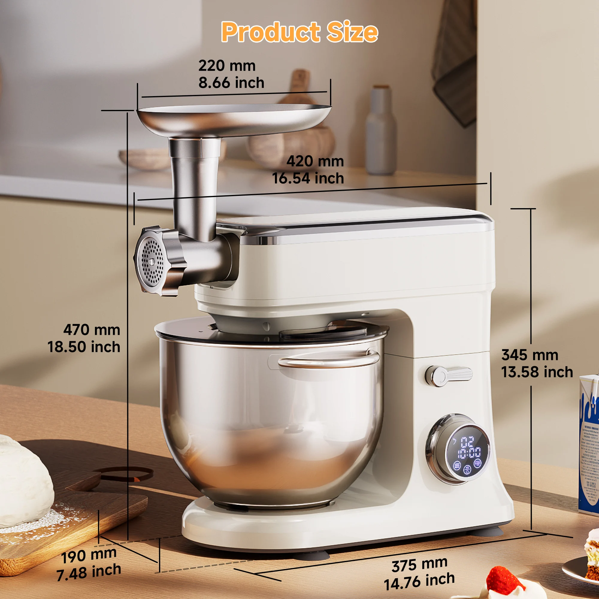 【Upgraded Multifunctional Design】 Mixers for baking not only includes 3 versatile attachments, Dough hook, Beater, Whisk. But also includes Meat grinder attachment (Updated BM606EG model with sausage stuffing function) for creating homemade burgers, sausages, and more.or mess-free use.