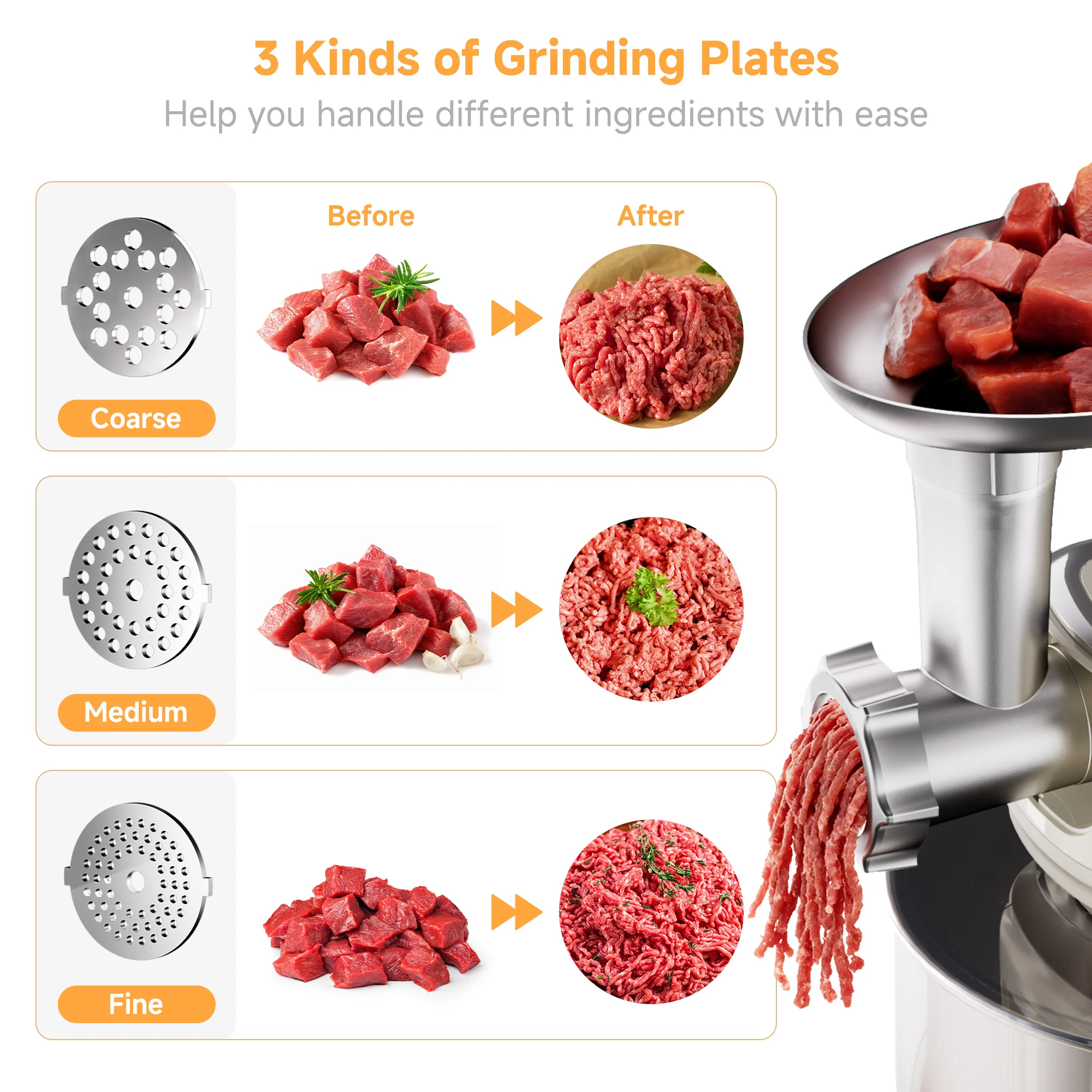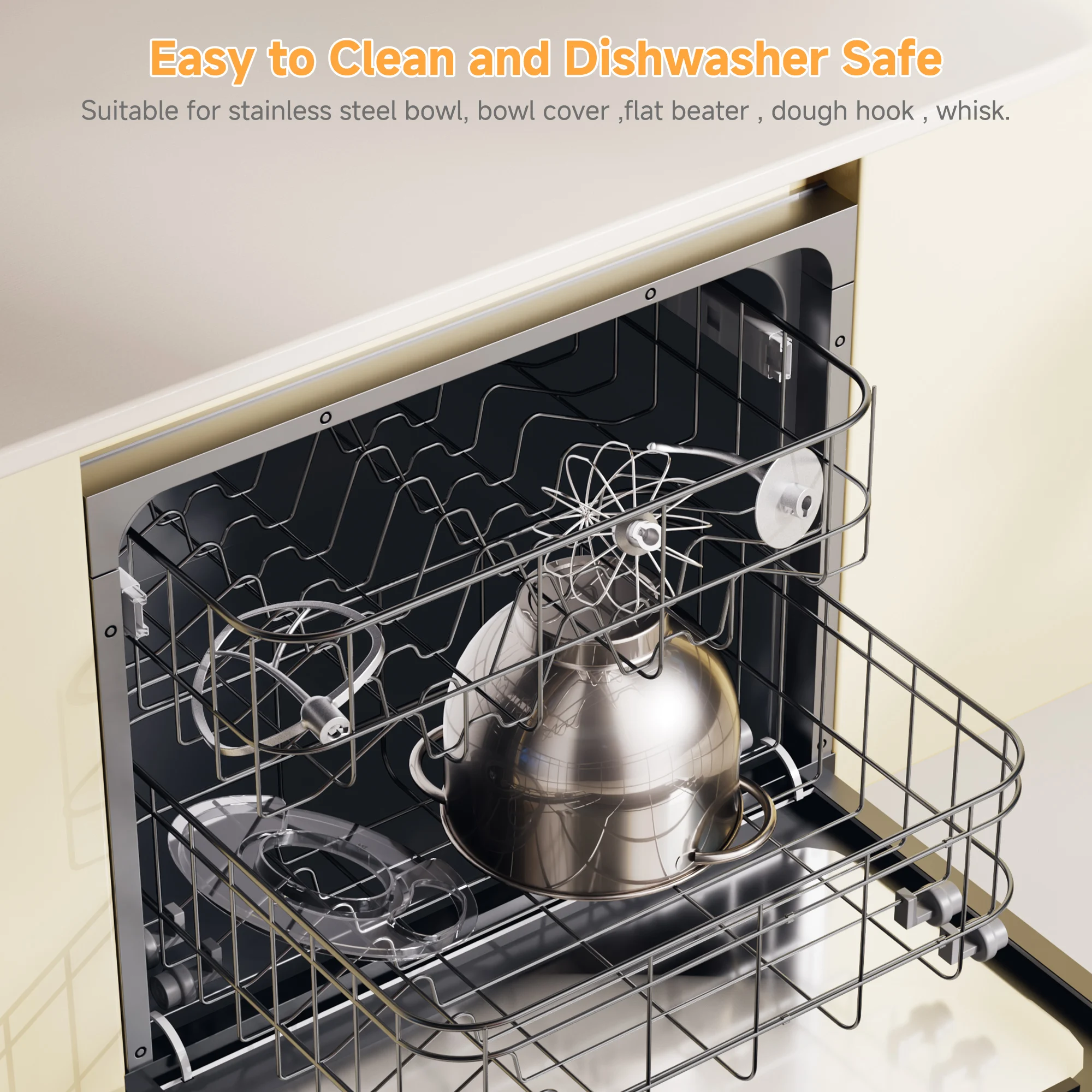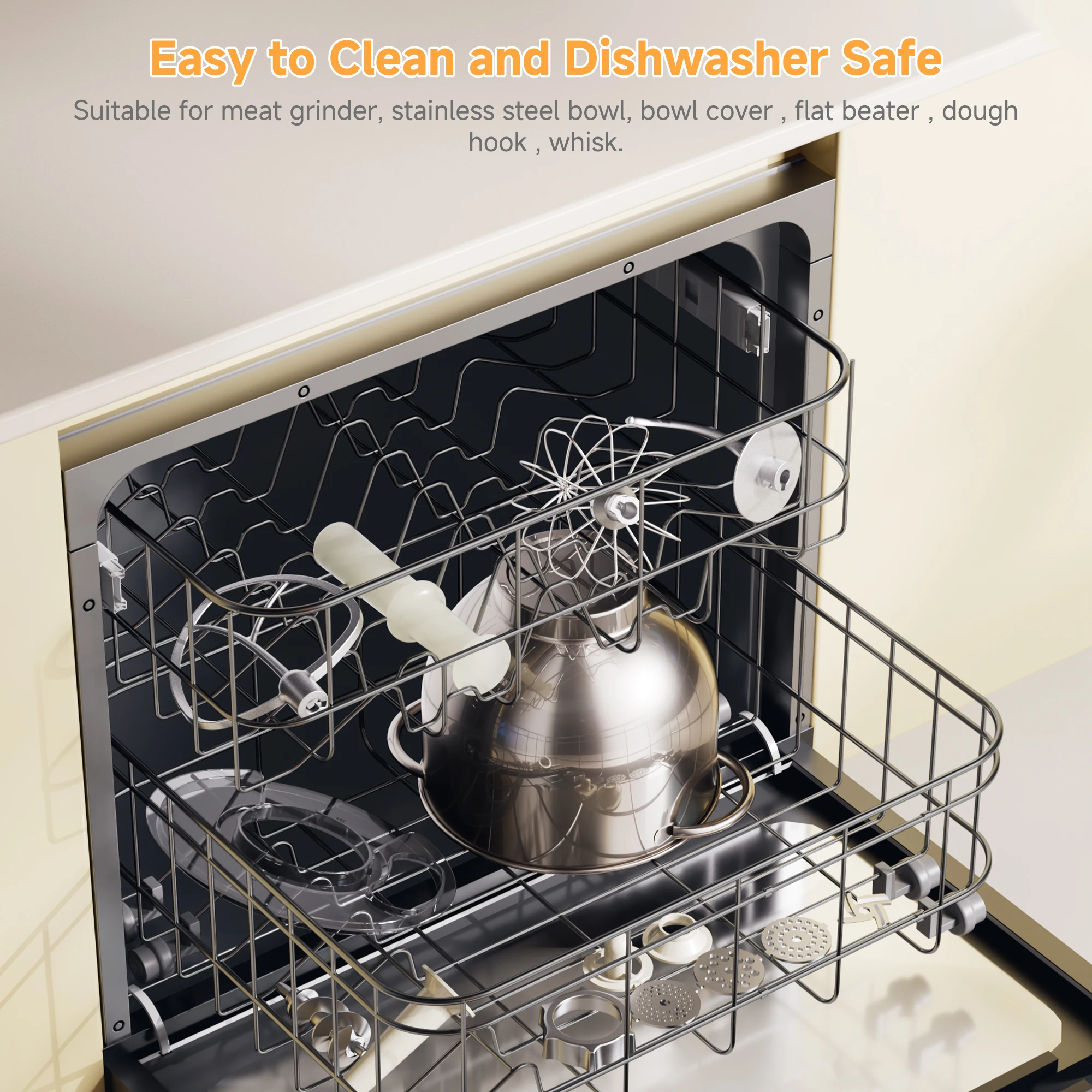 【Food-Grade Materials & Dishwasher-Safe】 The electric kitchen mixers including attachments, meat grinder components, are crafted from stainless steel and BPA-free materials, ensuring safety during food preparation. All accessories are easy to install, more durable, and dishwasher safe for easy cleaning.(Except for the Tray Hopper)