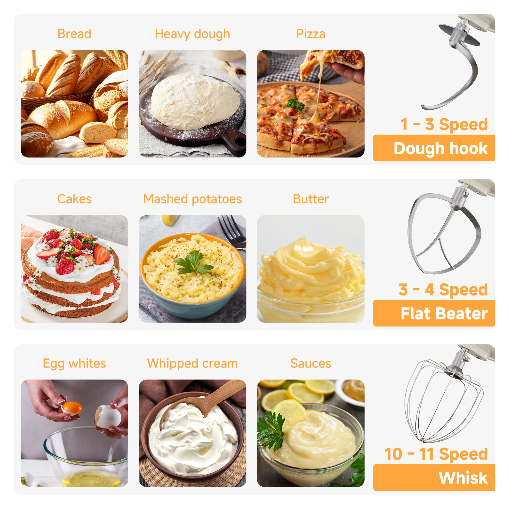 【Adjustable 11 Speed Settings】Our cake mixers with 11 speed settings, speeds 1-4 for kneading, 1-5 for mixing, 8-11 for whipping; 3-11 for meat grinder.