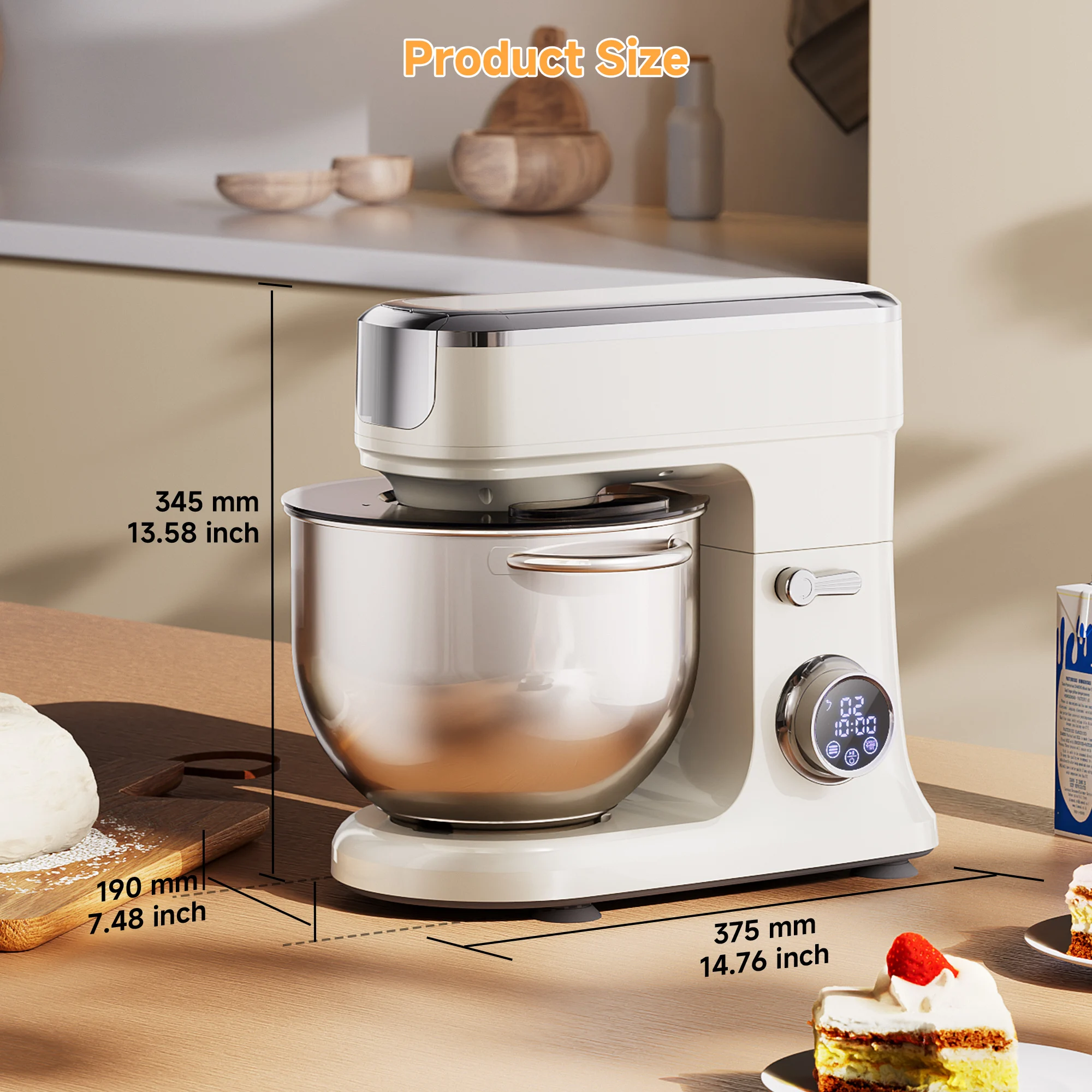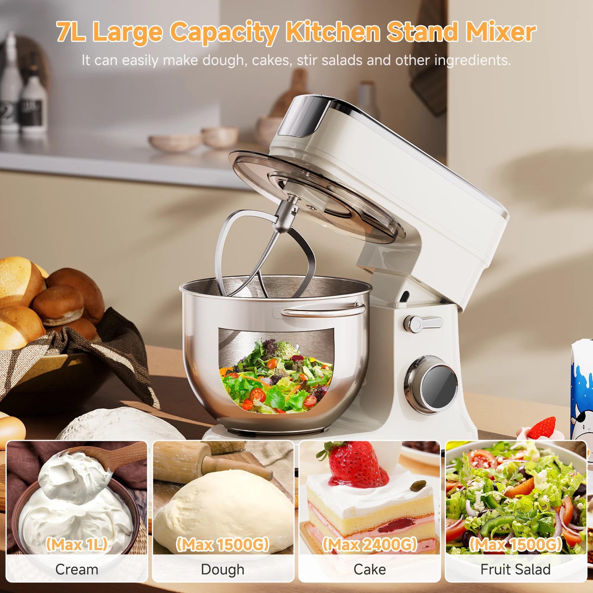【Strong Motor & 7L Bowl】The food mixers feature a powerful 1200W DC motor, delivering robust performance for mixing, kneading, and whipping tasks. More powerful motor but lower operation noise 68-75dB. 7L stainless steel bowl offers ample capacity.