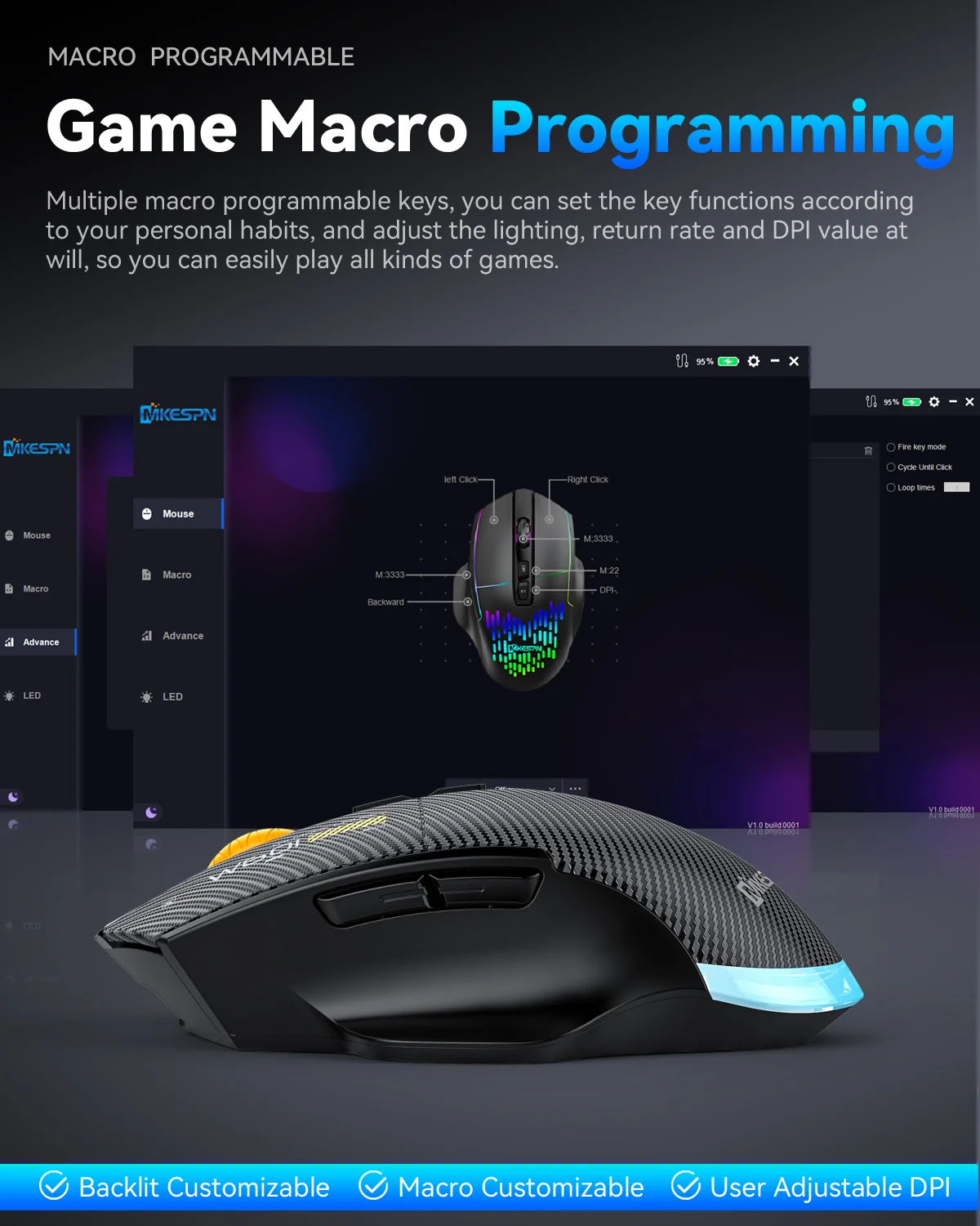 DPI key switchable: up to 12800DPI, with a return rate of up to 1000HZ. Ergonomic design, comfortable anti slip roller.