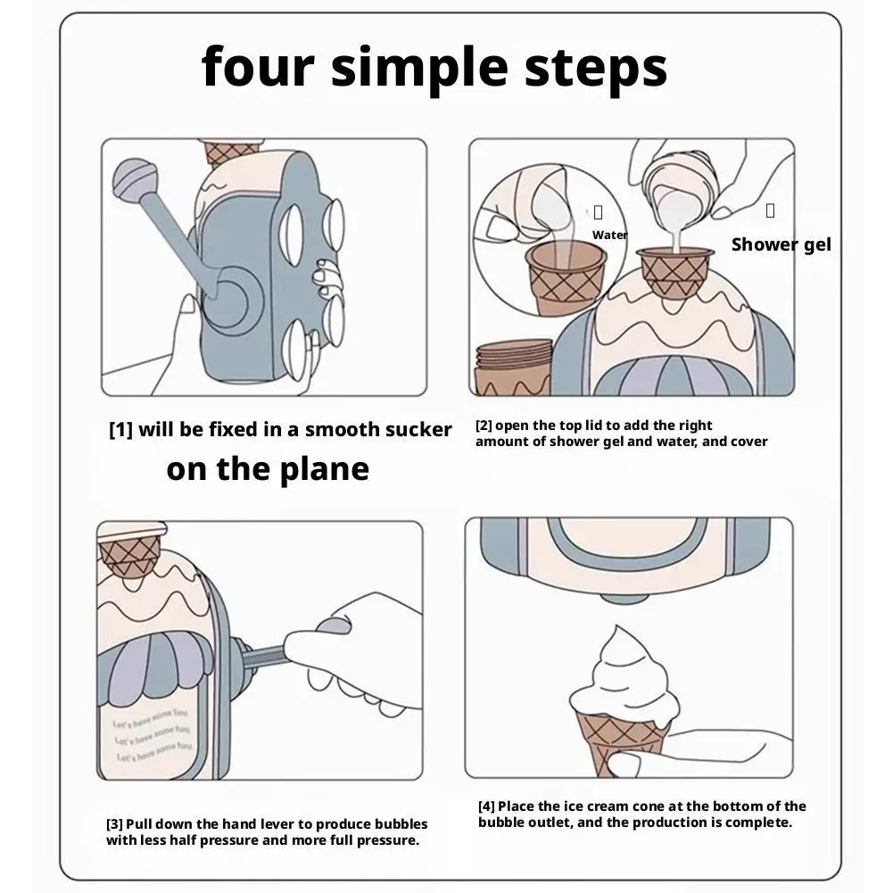 2.Bath toy is easy to operate and use. First, add the shower gel to the ice cream machine, then add water, take out the ice cream cone from the shelf, put the ice cream cone on the bubble outlet, and easily pull down the handle, bubbles will be generated, and the ice cream is ready.