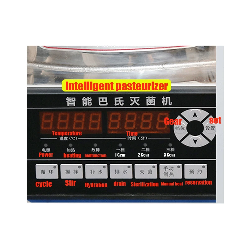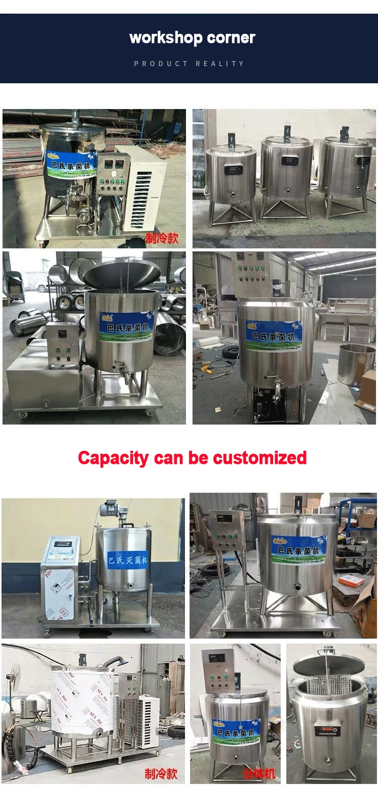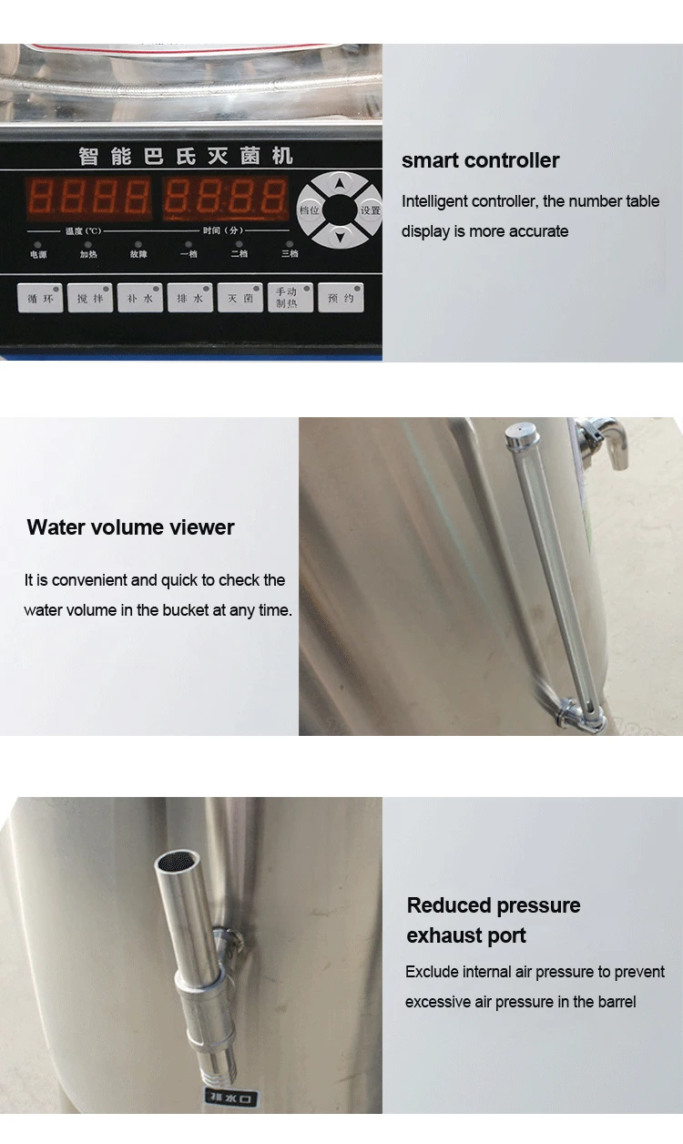 Name: pasteurization machinemodel: YX-MJJProduct number:GL0517Voltage: 220V/380Vpower:6KWCapacity: 50LMaterial: 304 stainless steelInside the barrel size: 50-70L diameter 40cm, height 40-50cmProduction: 50L=50kg/timeThickness: 1.5mm stainless steel sheetSterilization time: 30-50minSterilization temperature: suitable temperature: 65-99 ° (adjustable)Temperature range: 20-100° (adjustable)Heating system: This group of high-efficiency energy-saving stainless steel heating tubeSize:570*570*1050MMNote: There are 30L, 100L, 150L or other customized capacity, if you need,please contact customer service, thank you