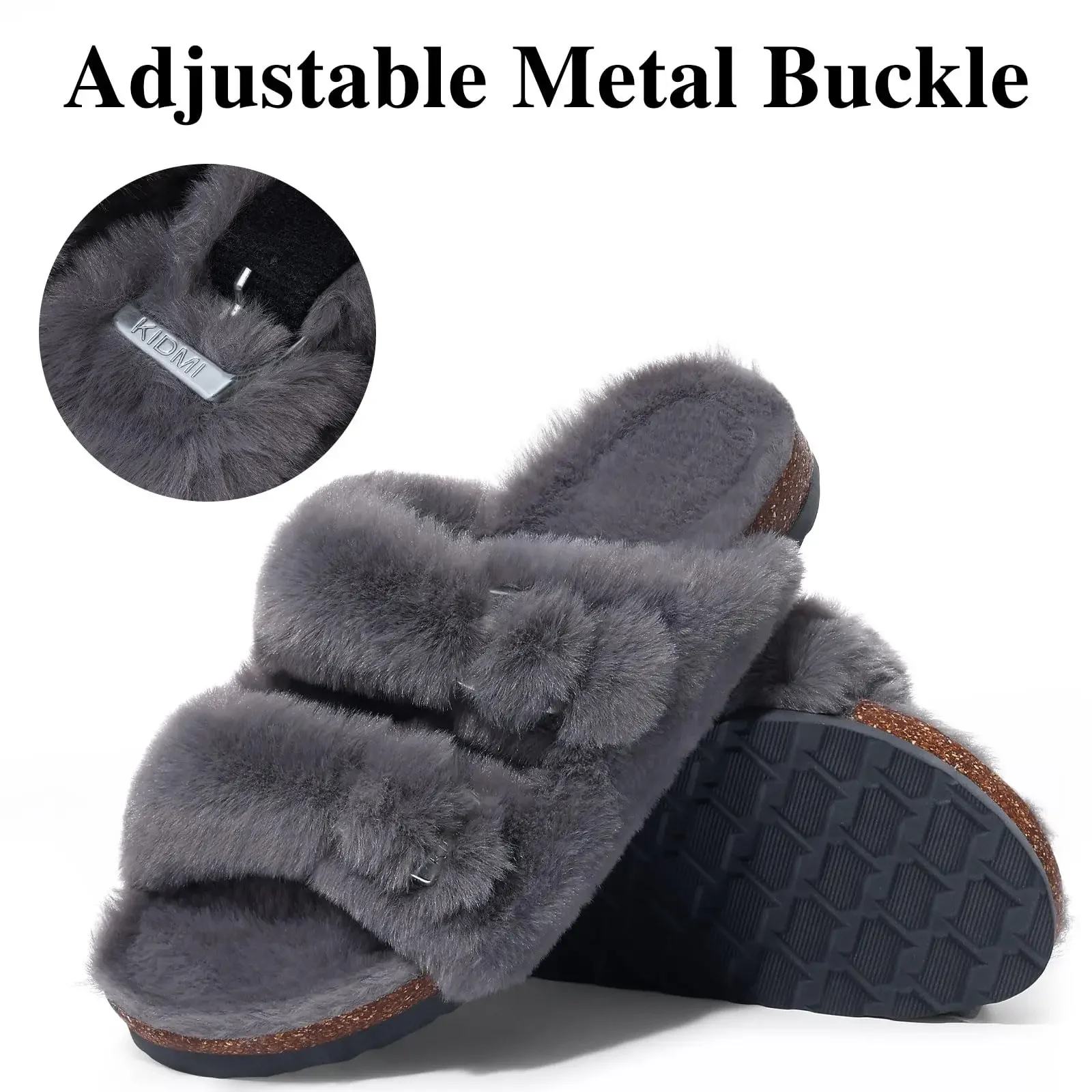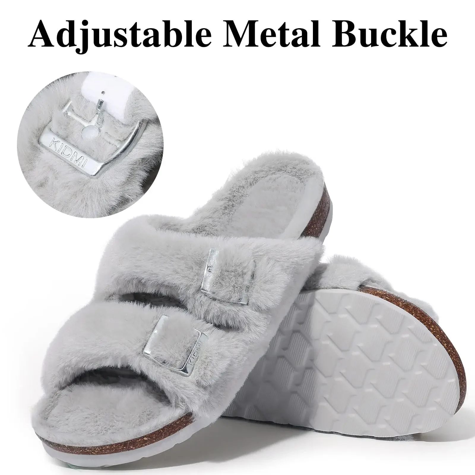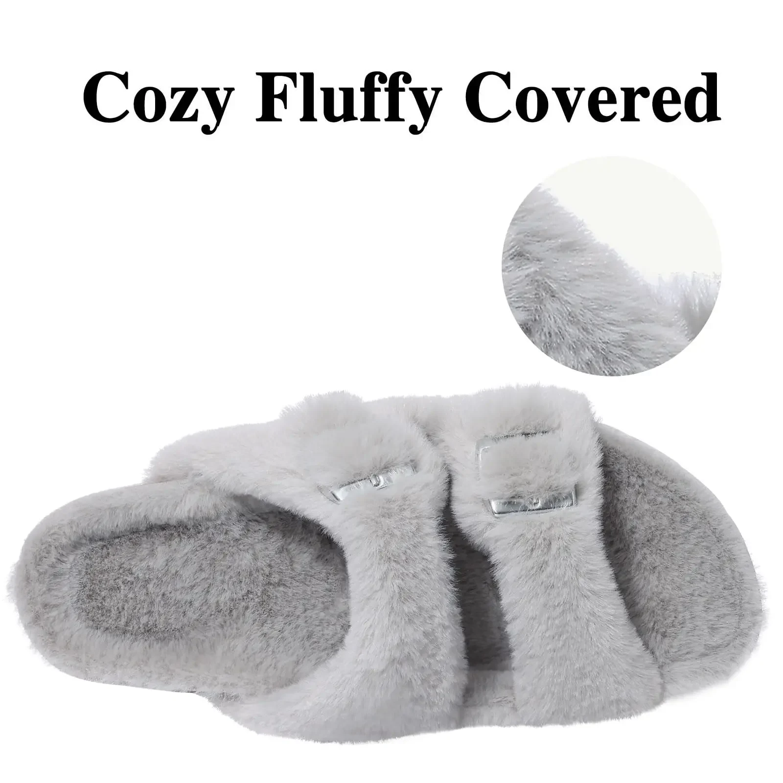 Comwarm Fashion Slippers For Women Cork Insole Comfort Slides Outdoor Fluffy Sandals With Adjustable Metal Buckle Arch Support