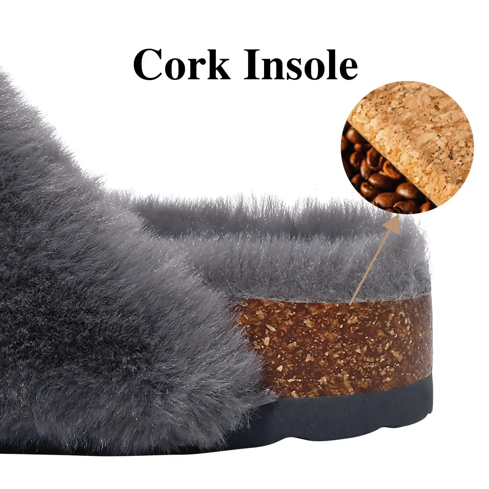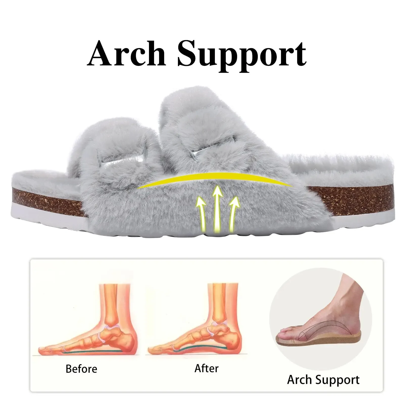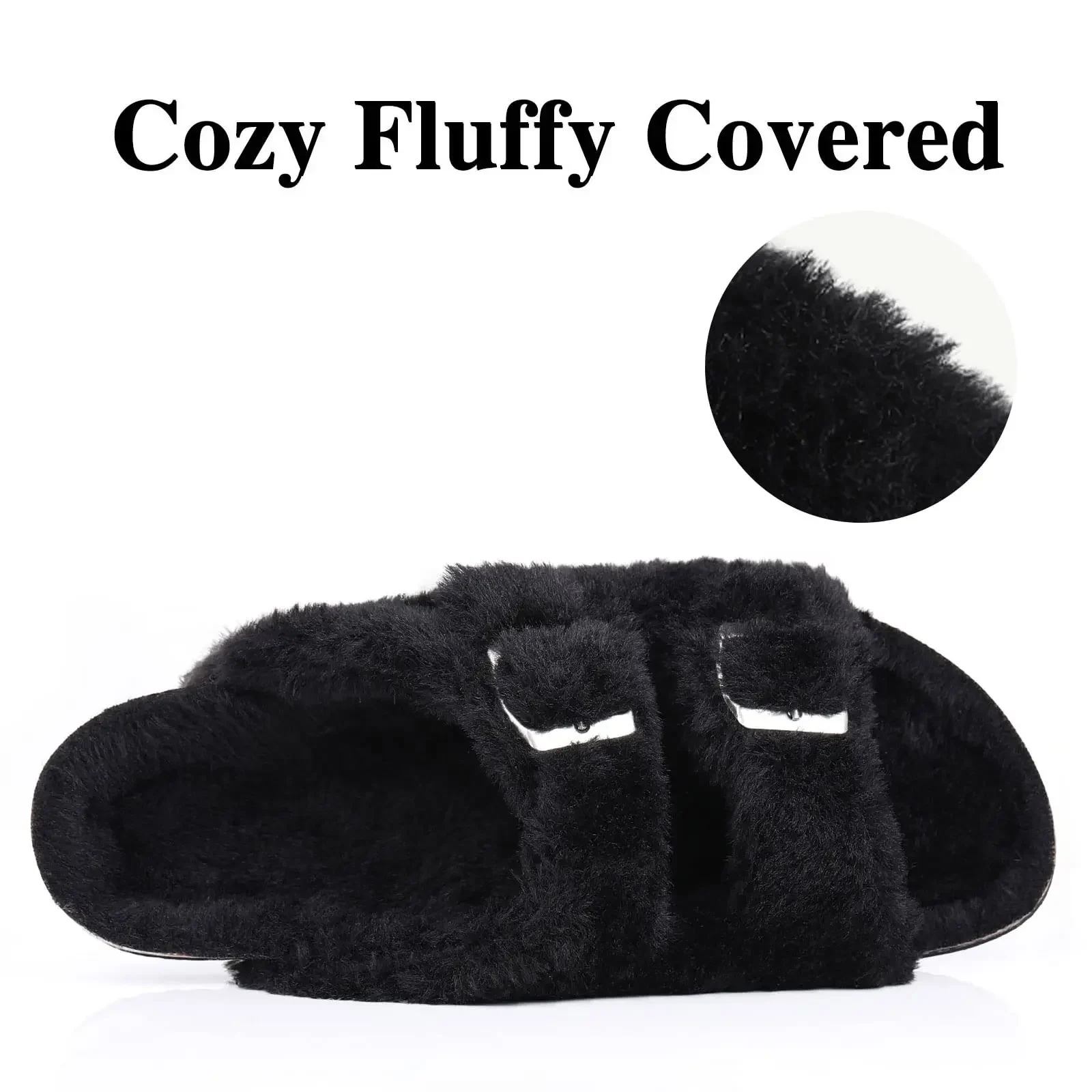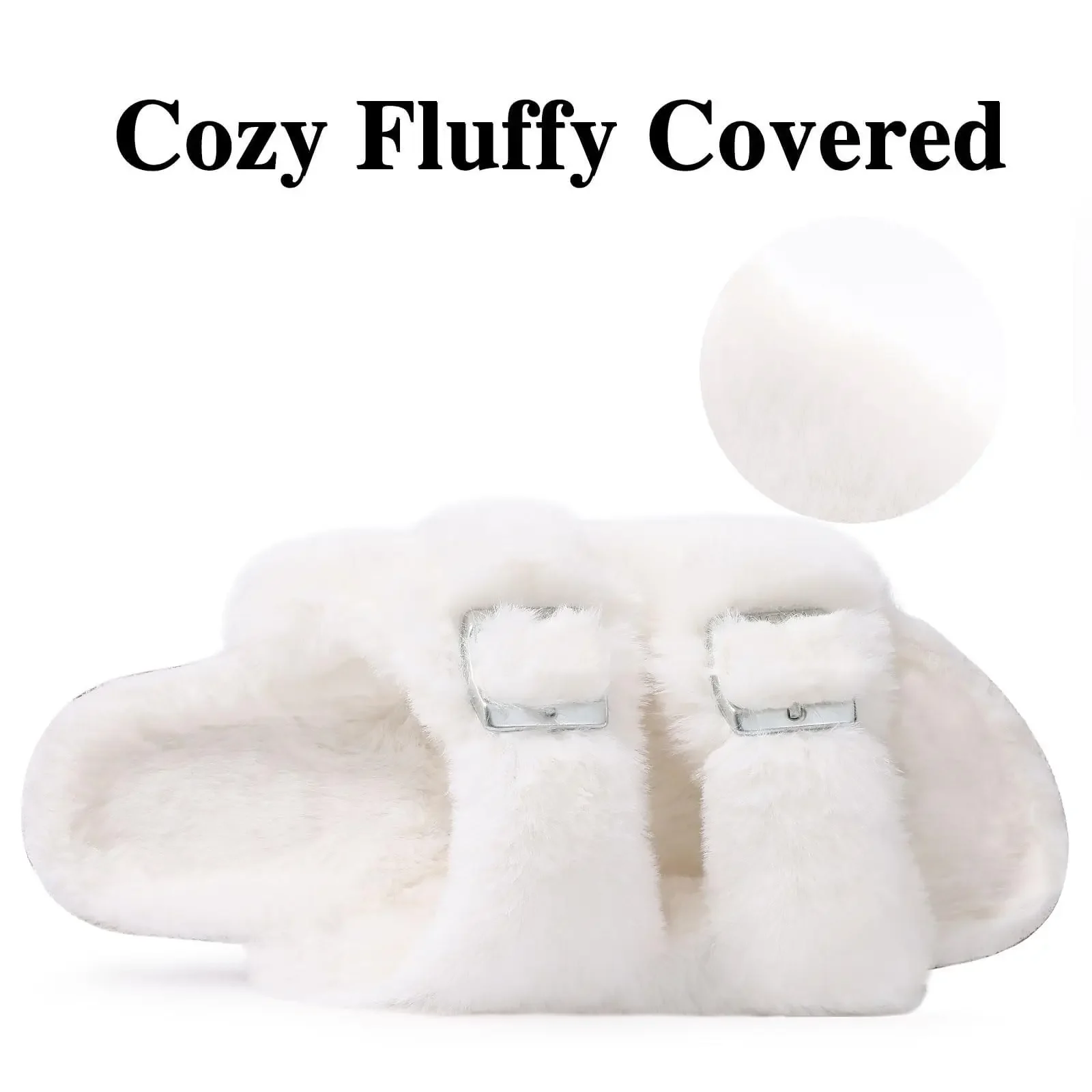 Comwarm Fashion Slippers For Women Cork Insole Comfort Slides Outdoor Fluffy Sandals With Adjustable Metal Buckle Arch Support