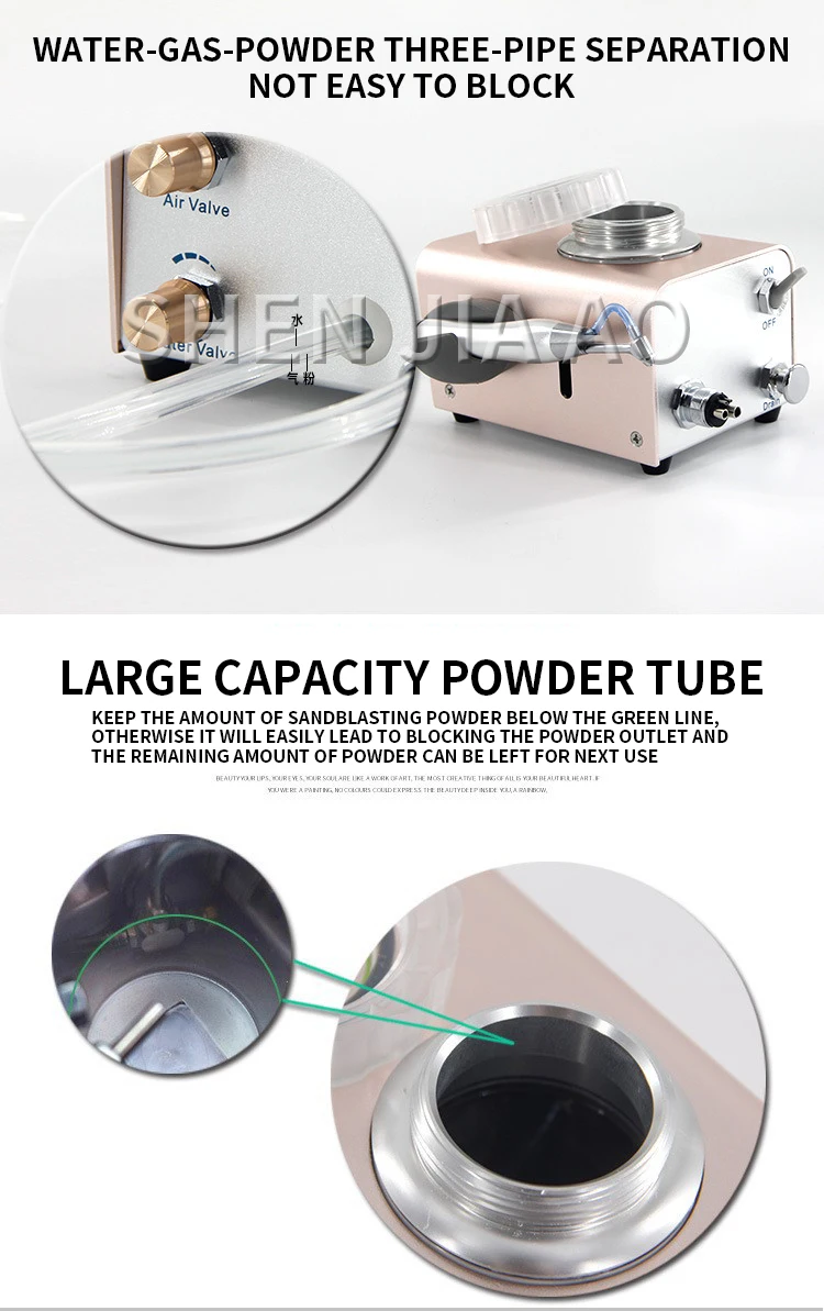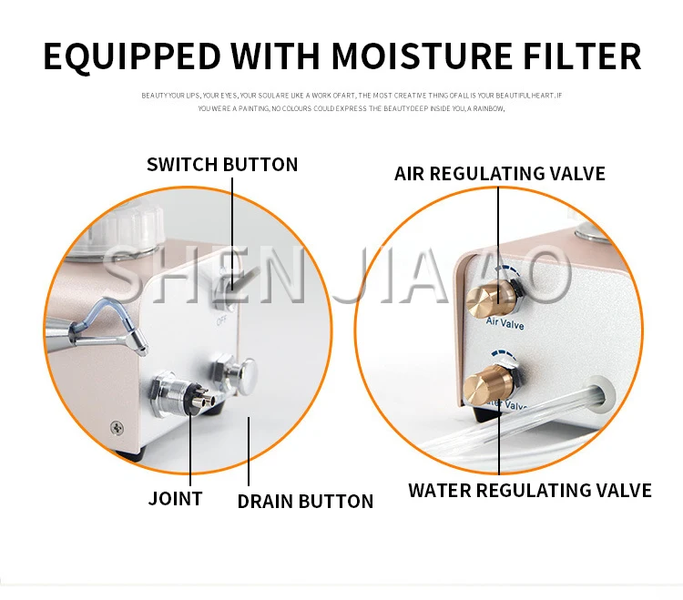 2) The air filter device can completely prevent moisture and oil and gas from forming powder into the jet handpiece or jet pipe, resulting in blockage;