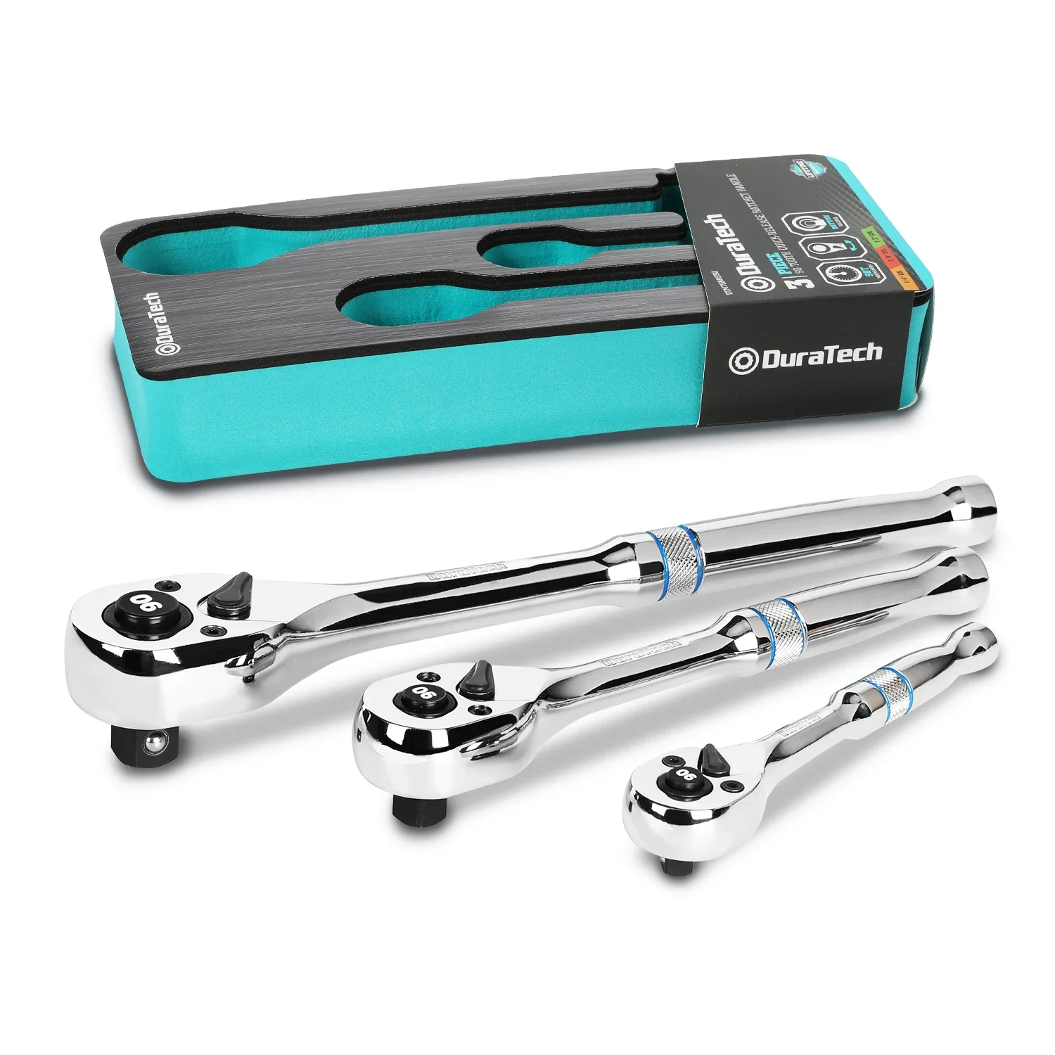 • This 3-piece ratchet set ensuring that you have the correct drive size within reach at all times, perfect for home maintenance and car repair. EVA foam dual colored storage tray for quick and easy access and safe storage