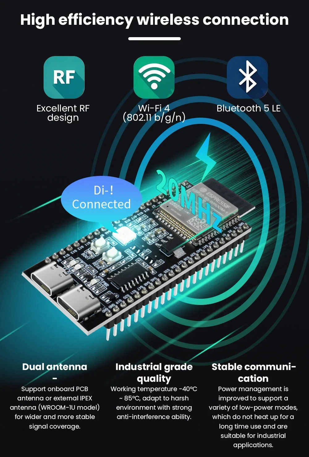 Built-in LED indicators and buttons (such as Boot and Reset buttons) for easy development and debugging.