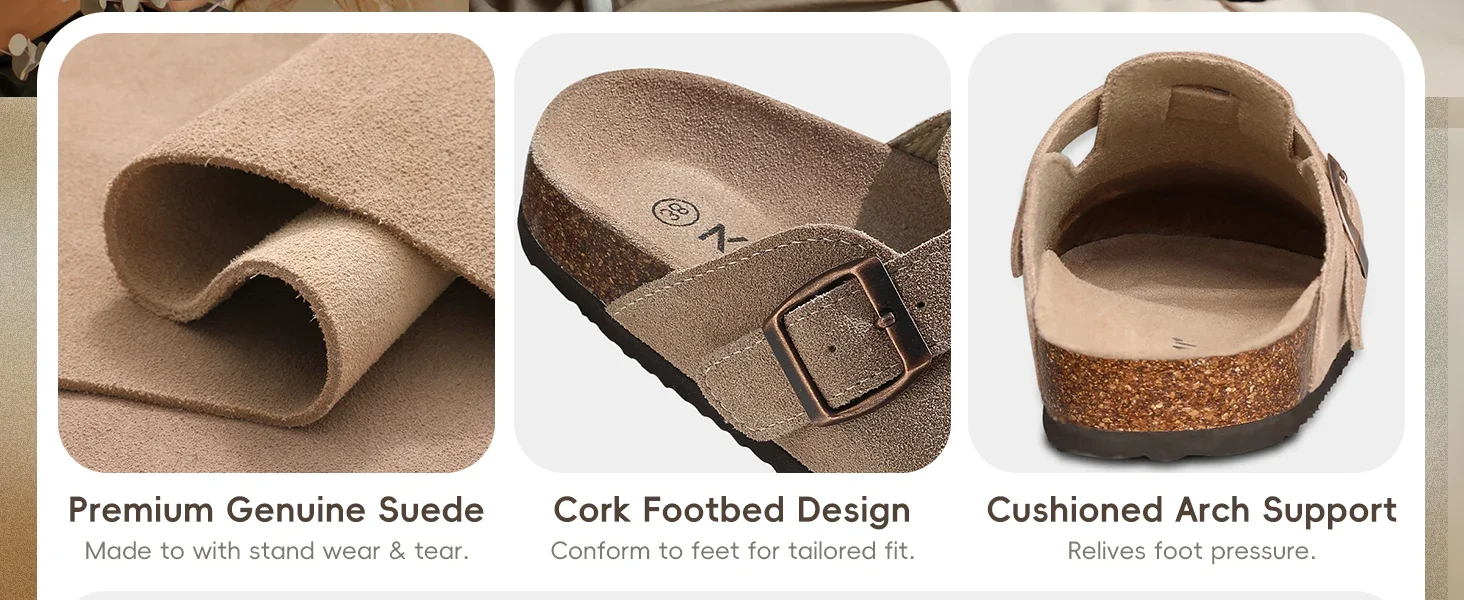 Ultimate Comfort: Soft deep heel cup cork footbed fits the foot shape great, preventing slipping off. Arch support relieves pressure, giving your tired feet a relaxing experience. Adjustable buckle allows various feet and lets you stay comfortably stylish with our fashionable clogs.