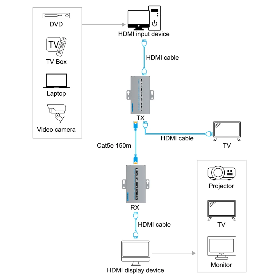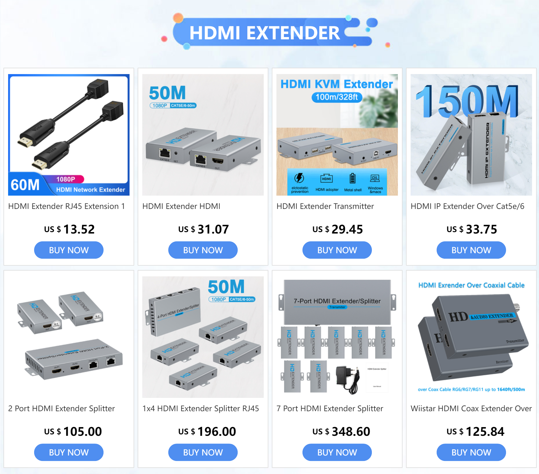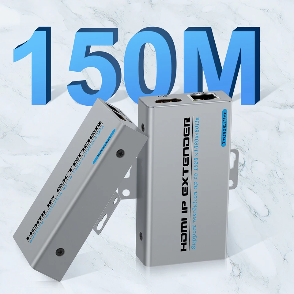 This HDMI extender provides extension of HDMI signals long distances over a single CAT5/5e/6 cable,up to 150m/492ft. It supports high resolution up to 1080P signal transmission. The extender can use for a wide range of applications requiring long distance transmission of high resolution with high quality by its good stability and powerful security.