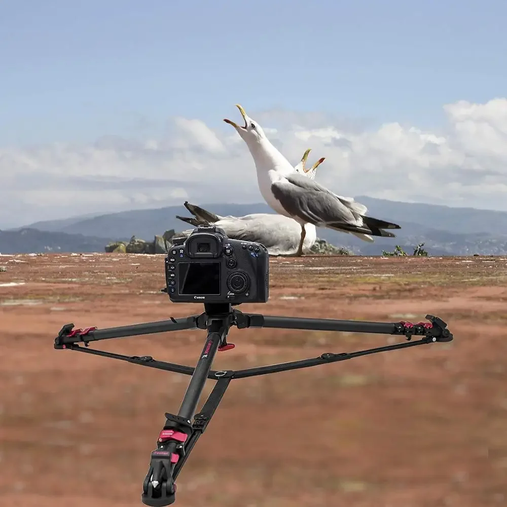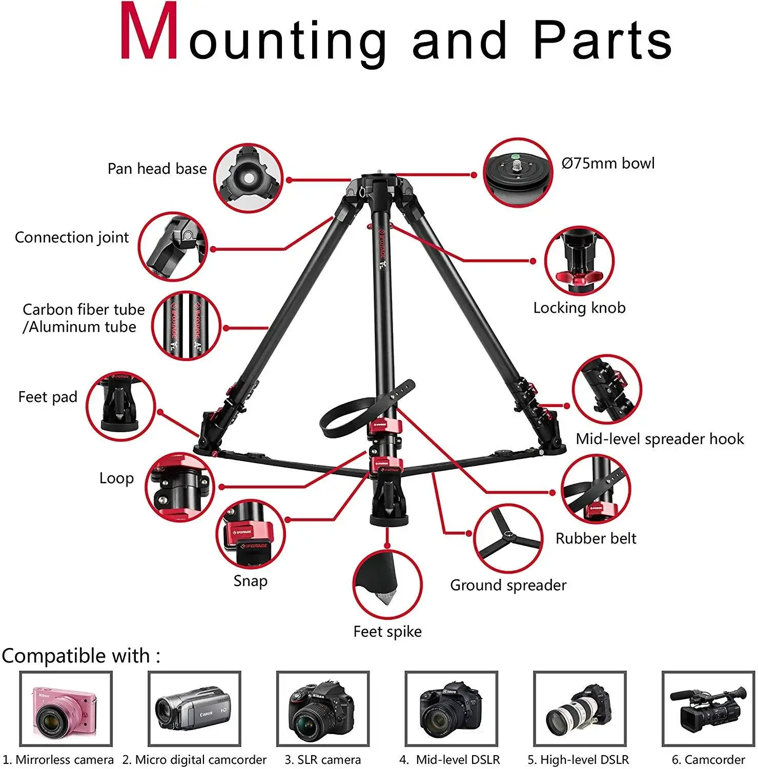 Extenional FunctionsThe included 1/4” & 3/8” screw holes on the side are suitable for most brands of recording monitors. Photo enthusiasts and videographers can use this tripod to shoot high-quality HD video footage. | Built-in Load ScrewA load screw is provided for adding weight to increase stability in windy situations. | Removable ⌀75mm BowlThe ⌀75mm sleek bowl head includes a quick release plate with 3/8 screws for most camera equipment. Also included a removeable 75mm bowl and mount ball head. | Interchangable Foot Spikes and Foot PadsThe special foot design has both nails and anti-slip rubber pads for all terrain use. Convenient and portable while providing superior stability with a claw-like support. |