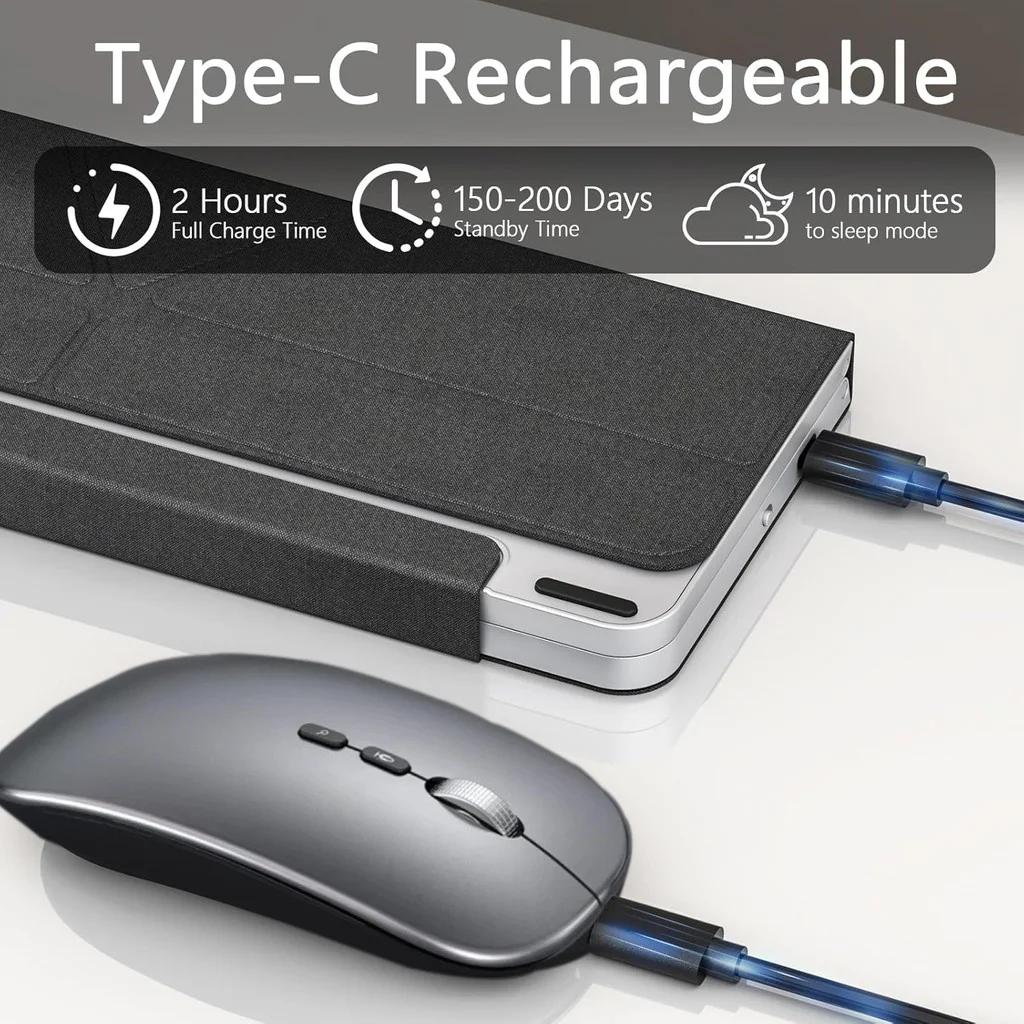Skip constant charging: Built-in batteries in keyboard mouse recharge fast (1-2 hours via included Type-C). Enjoy 120 days keyboard standby* and auto-sleep after 10 idle minutes. Tap any key to instantly wake – perfect for forgetful users and saving power