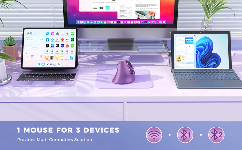 • 1 Mouse for Multi-purpose — This versatile mouse can connect to up to three devices simultaneously using Bluetooth 5.0, Bluetooth 3.0, and 2.4G Wireless, allowing you to switch between devices with just 1 click for seamless multitasking