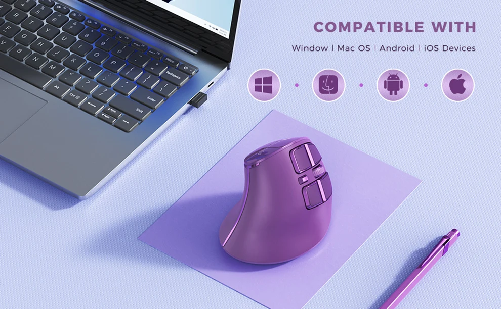 This mouse connects to 3 devices via Bluetooth 5.0 + Bluetooth 3.0 + 2.4G USB receiver simultaneously, the switch button is just near your thumb for switching between3 devices easily, with conspicuous lights on the top of the mouse to let you know which connection mode you are using