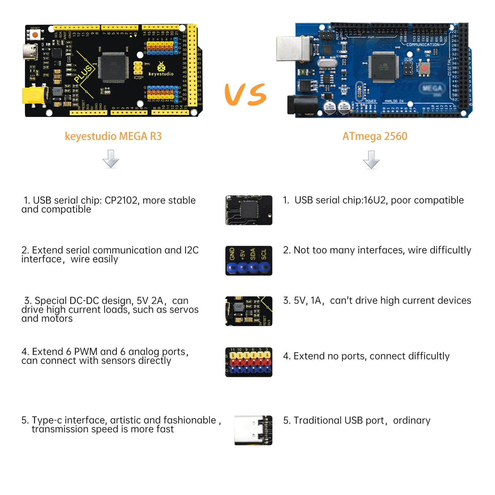 KEYESTUIDO Mega 2560 plus Board ، الذي معالج النواة هو ATMEGA2560-16AU ، متوافق تماما مع اردوينو ميجا 2560 REV3. أوسب إلى تل رقاقة يعتمد أكثر اقتصادية ومستقرة CP2012. يتكون هذا المجلس زائد من 54 قناة المدخلات الرقمية والمخرجات الموانئ ، والتي يتم تقديم 15 دبابيس كما إخراج بوم ، 16 المدخلات التناظرية ، 4 منافذ الاتصالات التسلسلية ، واحد 16MHz مذبذب الكريستال ، 1 منفذ USB ، 1 مقبس الطاقة ، 1 واجهة ICSP و 1 زر إعادة تعيين.