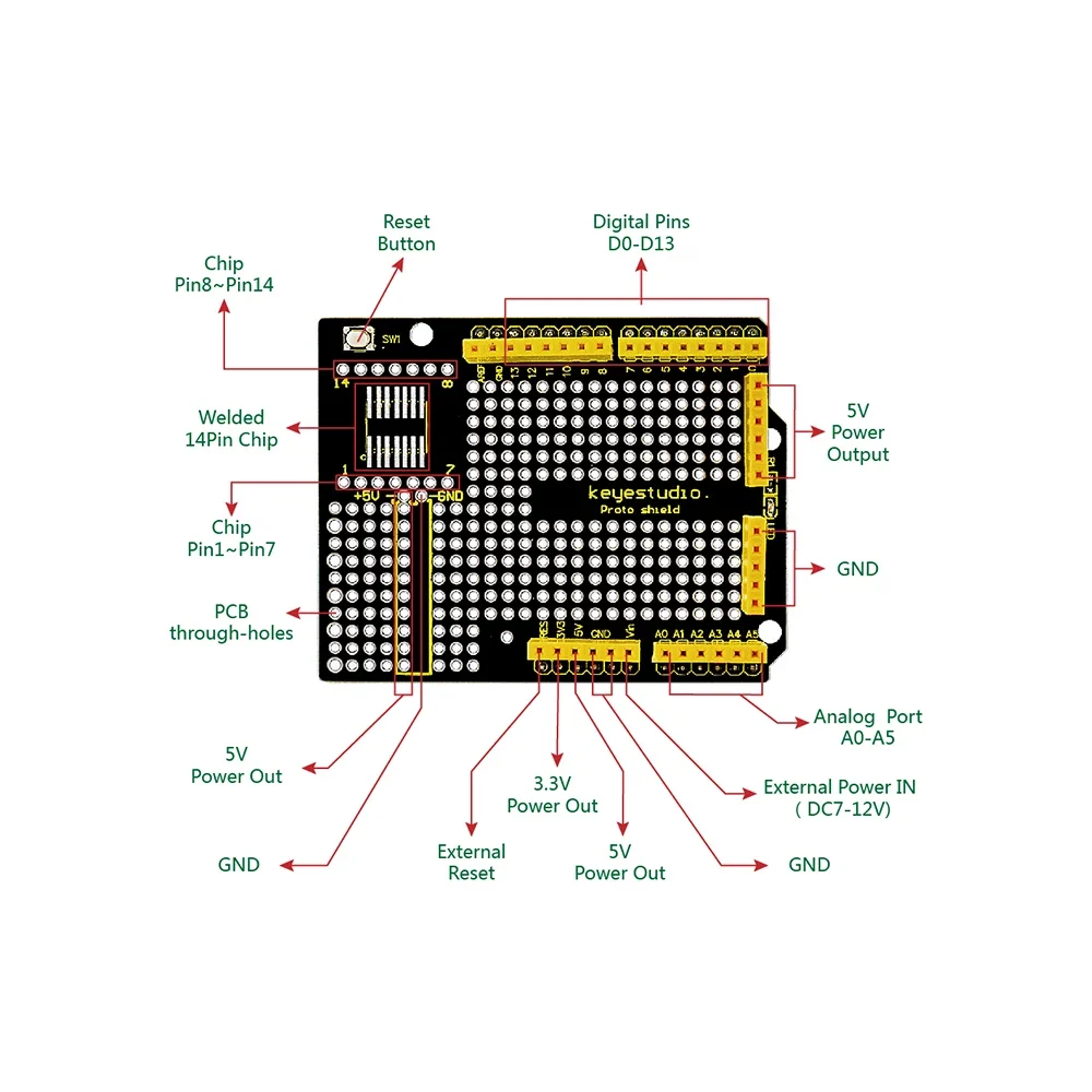 Keyestudio Proto Shield is particularly designed for the Arduino UNO R3. It makes it easy for you to design custom circuits and solder electronics directly on it.For convenient use, there is a large prototyping space of both connected and unconnected spaced through-holes on the shield.There is also a soldering position reserved for SMD chip on the protoshield. You can easily solder SMD ICs on the prototyping area to test them with your Arduino board.