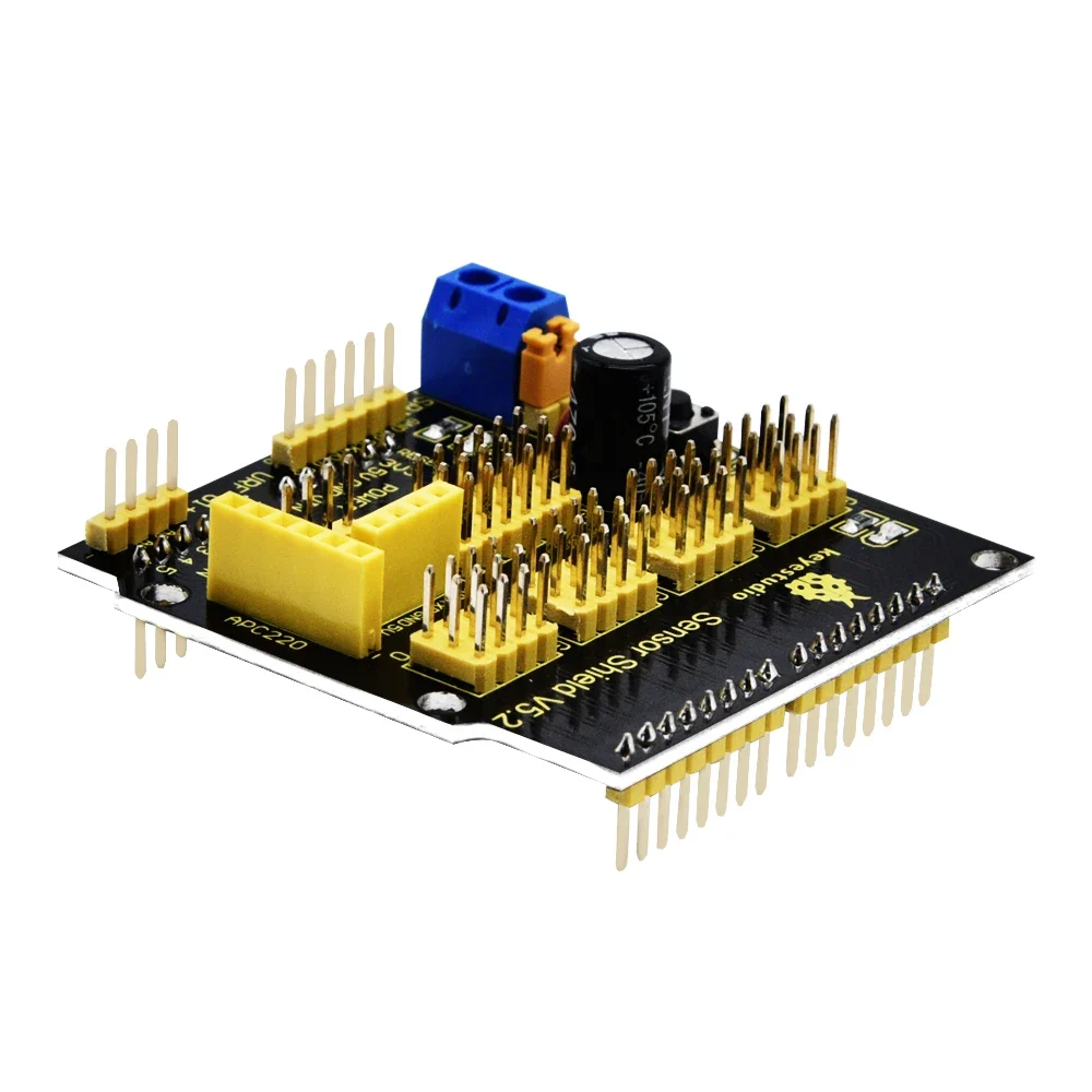 This keyestudio sensor shield has extended the digital and analog ports out as 3PIN interface (G,V, S), which can directly connect 3PIN sensor modules.It also breaks out some communication pins of 2.54mm pitch, like serial, IIC, and SPI communication.The shield comes with a reset button and 2 signal indicators as well.Additionally, you can supply the voltage needed to the sensor modules through .