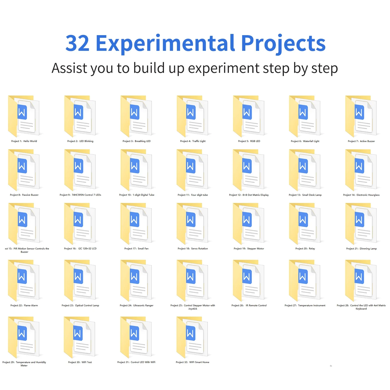 As many as 32 project tutorials are provided, which contain detailed wiring diagrams, component knowledge, test code, and so on.