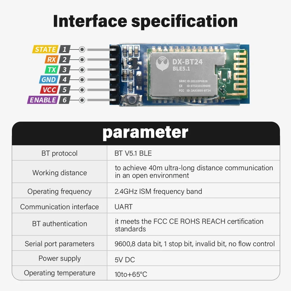 DX-BT24 5.1 Bluetooth module is built for intelligent wireless data transmission. It uses the DAILOG 14531 chip, configured with 256Kb space and follows the V5.1 BLE Bluetooth specification.Support AT instruction, users can change the serial port port rate, device name and other parameters as needed, flexible use.This module supports UART interface, and supports Bluetooth serial port transmission, with the advantages of low cost, small volume, low power consumption, high sending and receiving sensitivity, only equipped with a few peripheral elements to achieve its powerful functions.