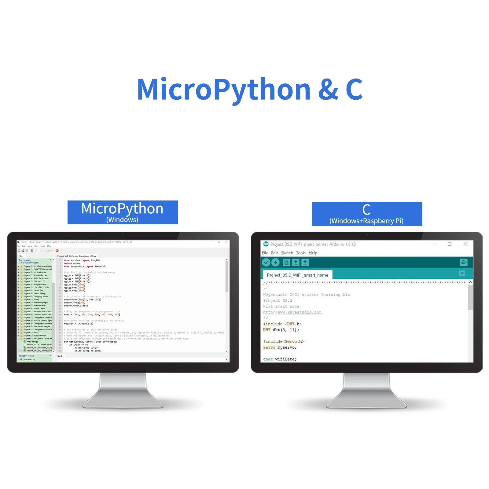 As many project tutorials are provided, which contain detailed wiring diagrams, components knowledge, and fascinating project code. Each project is produced using Thonny for Windows, Arduino IDE for Windows, and Arduino IDE for Raspberry Pi. It’s easy to get started.