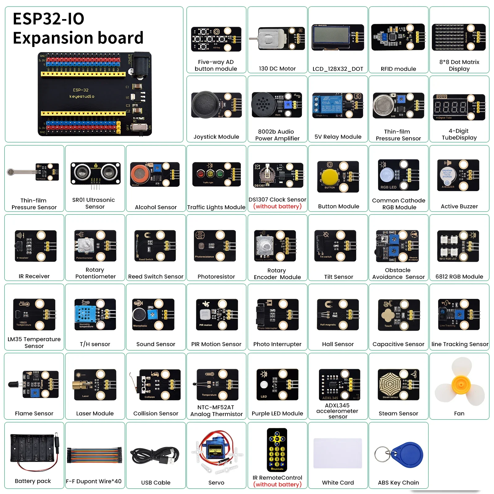 The Keyestudio ESP32 42 in 1 sensor kit mainly contains 42 commonly used sensors/modules, a ESP32 board, a ESP32 expansion board and Dupont wires.
