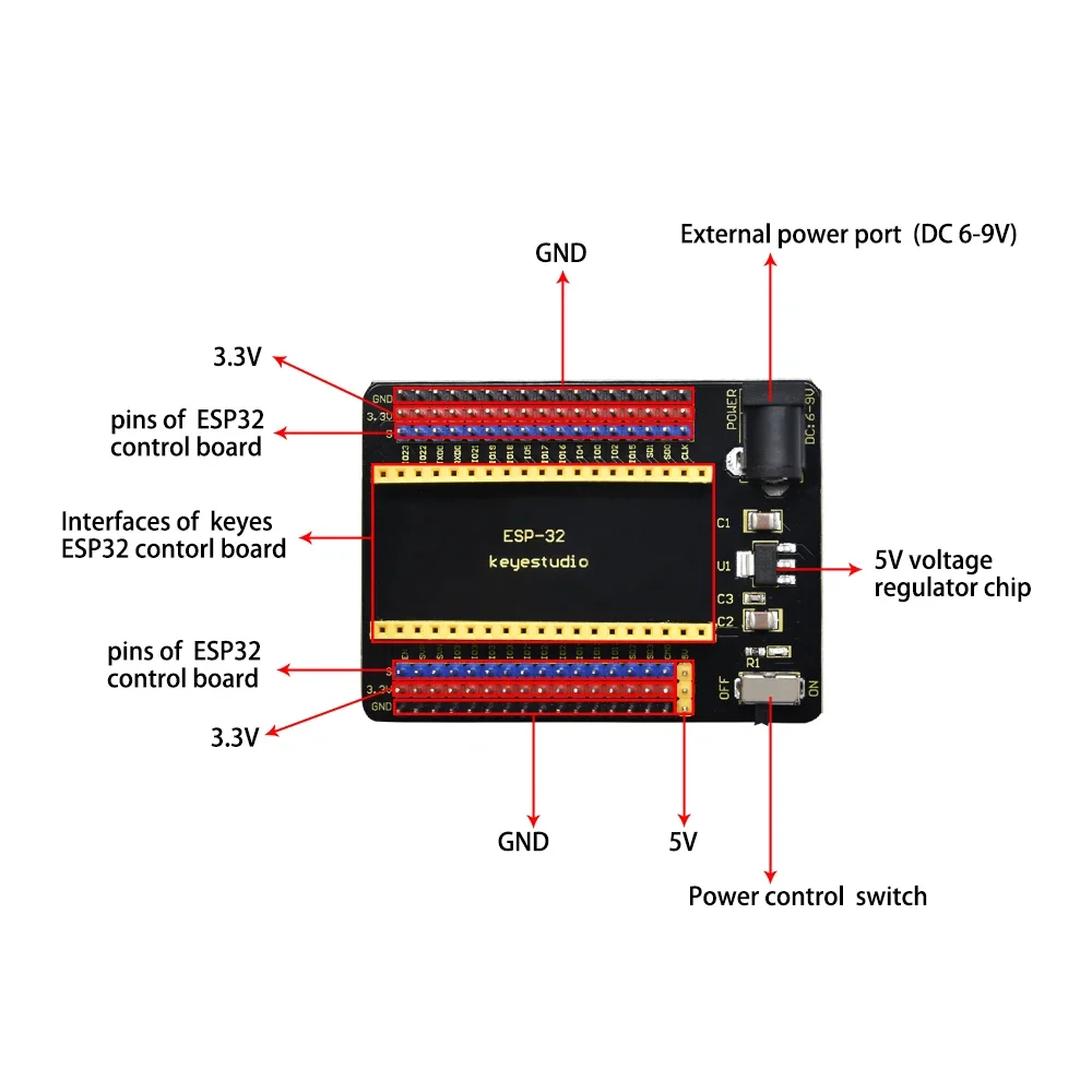 The keyestudio ESP32-IO shield is designed to be compatible with the keyestudio ESP32 Core board. The ESP32-IO shield has brought out all the pins of keyestudio ESP32 Core board in the form of 2.54mm pin header.