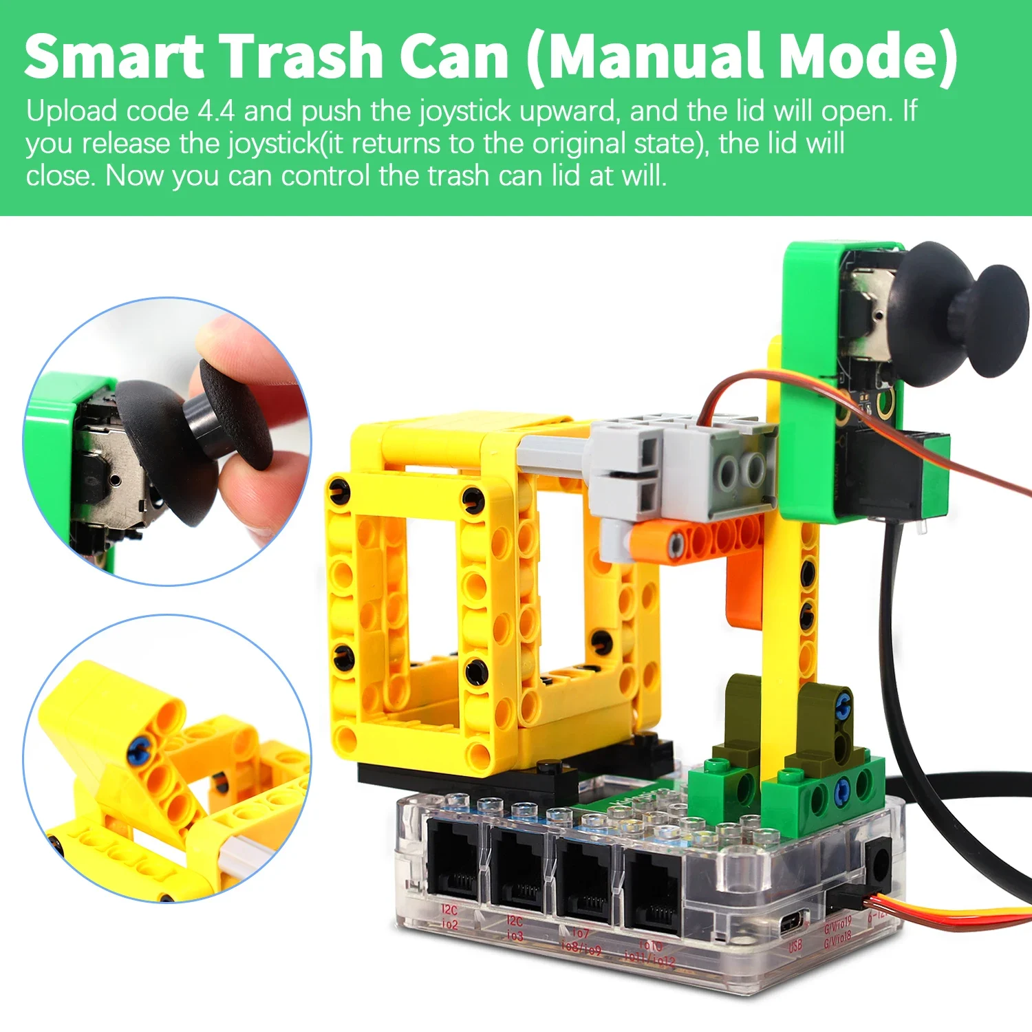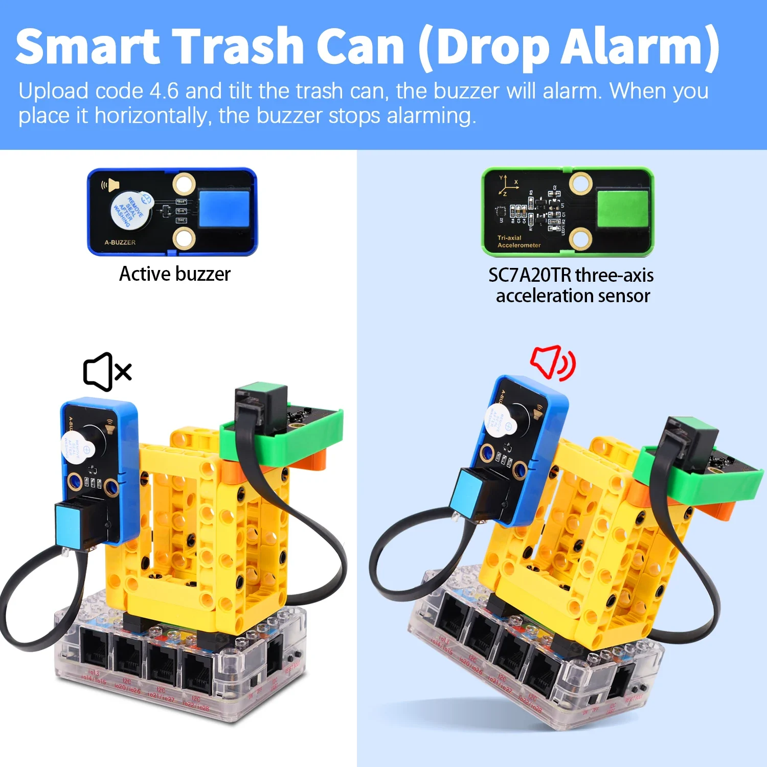 In this kit, multiple sensors and modules are included: white LED module, 3V relay module, button module, active buzzer, obstacle avoidance sensor, photoresistor, potentiometer, joystick module, SC7A20 three-axis acceleration sensor and servo. Besides, it can transforms into six appearances with building blocks: manual lighting, automatic lighting, light adjustment, smart trash can(manual mode), smart trash can(automatic mode), smart trash can(drop alarm). The building blocks are provided, so you may design forms at will, which greatly improves logical analysis, creativity, hands-on skills and problem-solving ability.