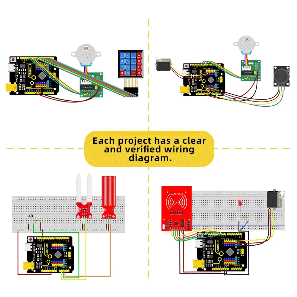 4、Includes keyestudio 328plus UNO controller board and Tpye C USB cable, 100% compatible with Arduino IDE Official R3 and Official arduino starter kit.