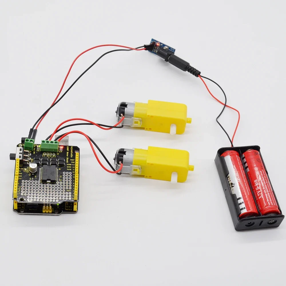 You can use UNO R3 microcontroller and add external components to complete a variety of amazing experiments, such as smart robot DIY. When DIY your robot, it is necessary to use the motor driver board to drive the DC motors, however, sometimes need to connect the motor drive board to UNO using lots of jumper wires, pretty inconvenient.